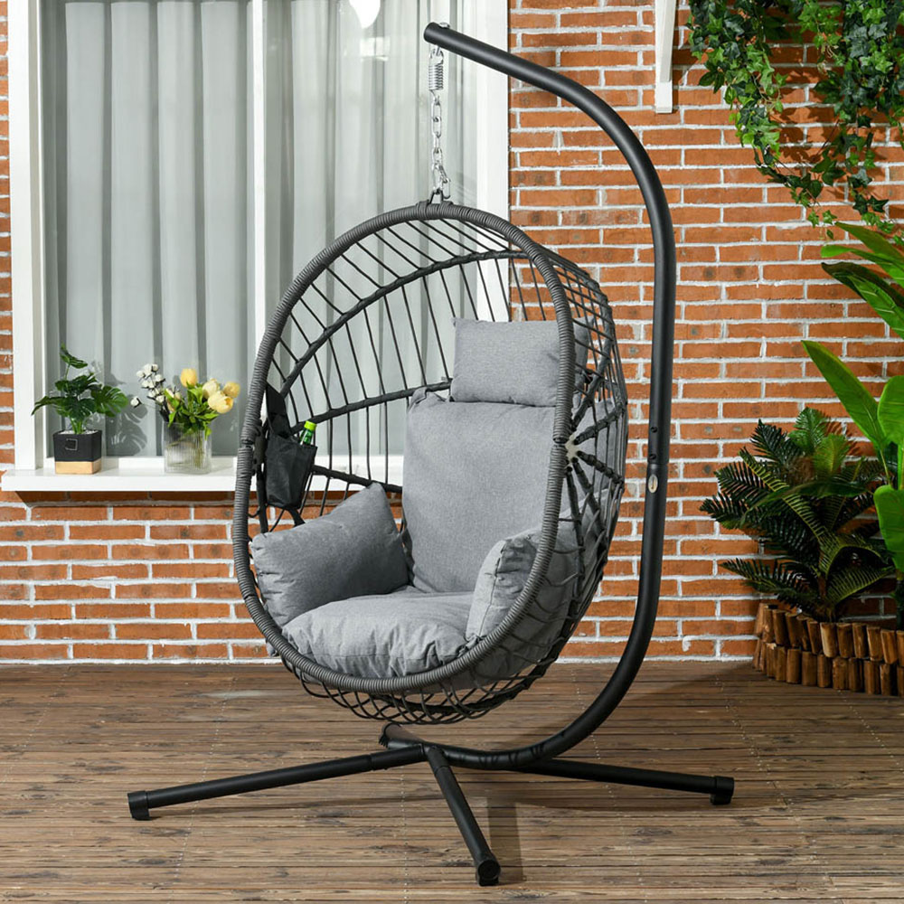 Make the most of lazy summers with this Outsunny Grey Rope Hanging Swing Chair with a Stand. The curved back, spacious seat and thick padded cushion offer a comfortable sitting experience. Sturdy and strong, the stand is made from a powder-coated steel frame and supports up to 120kg. Space-saving, the foldable seat is simple to store away when not being used. Also, large in size, the egg chair gives you plenty of room to relax and take time out. Protect your garden furniture with our durable and waterproof covers. Explore our wide range of heavy-duty Garden Furniture covers to find the perfect fit for your needs.