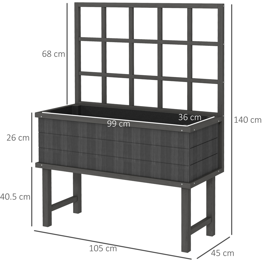 A charming grey wooden raised planter, perfect for cultivating a vibrant display of flowers and plants and vegetables. Its clever double-planting box design maximises growing space, bringing a touch of nature',s beauty to any setting. Enhance your garden further with the integrated three 5-grid trellis, ideal for climbing plants or decorative embellishments. Crafted from robust fir wood for lasting outdoor use, this planter is designed for resilience. A soil-retaining fabric lining and convenient drainage holes complete this practical and aesthetically pleasing addition to your garden.