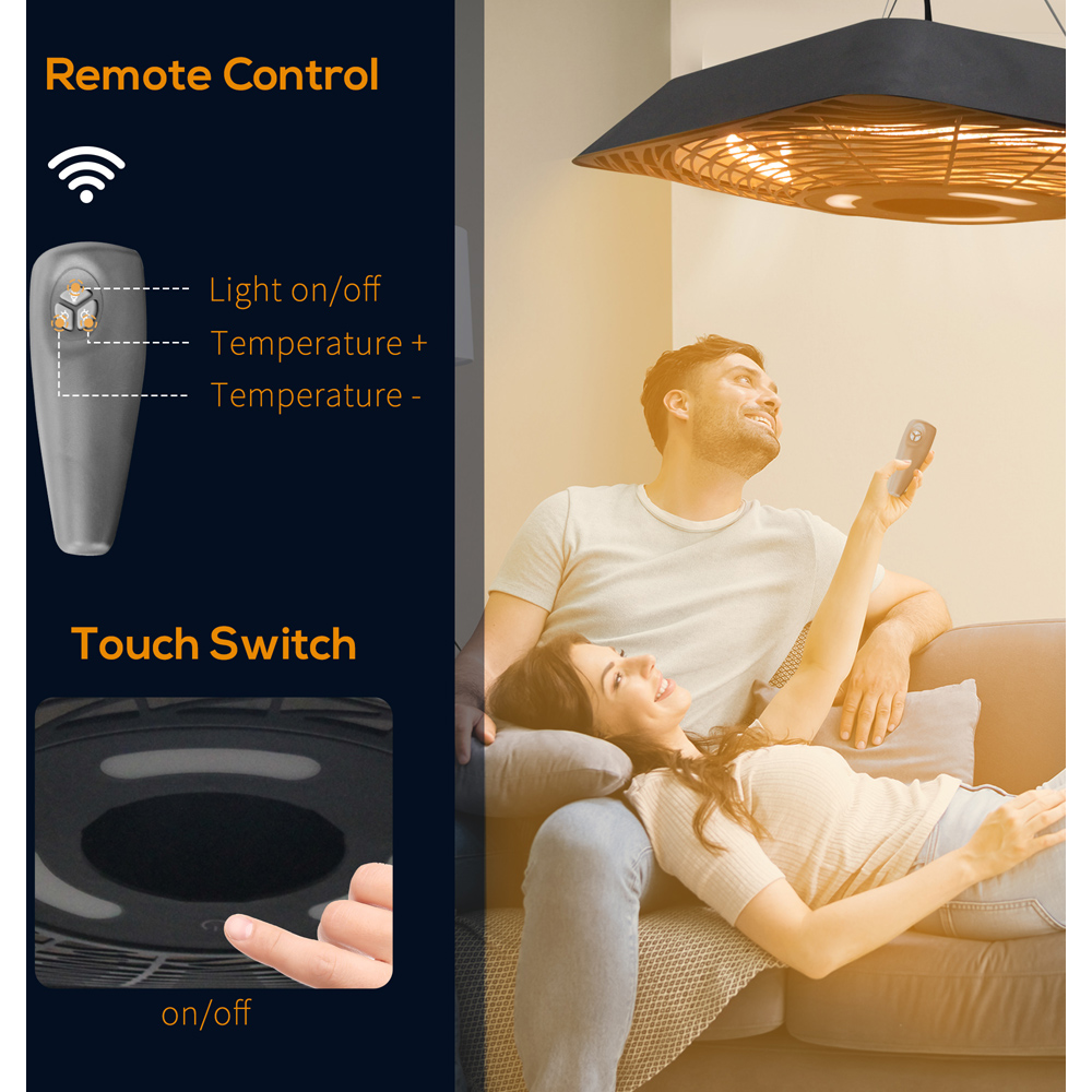 Enjoy the warmth of your patio even on the chilliest evenings with this stylish hanging heater. Its elegantly curved square design complements any outdoor space, while its powerful halogen bulbs provide adjustable warmth. Choose from 800W, 1200W, or 2000W settings for precise temperature control. A convenient remote control allows you to activate the light independently of the heating function, offering versatile ambiance. Perfect for extending your outdoor enjoyment throughout the colder months.