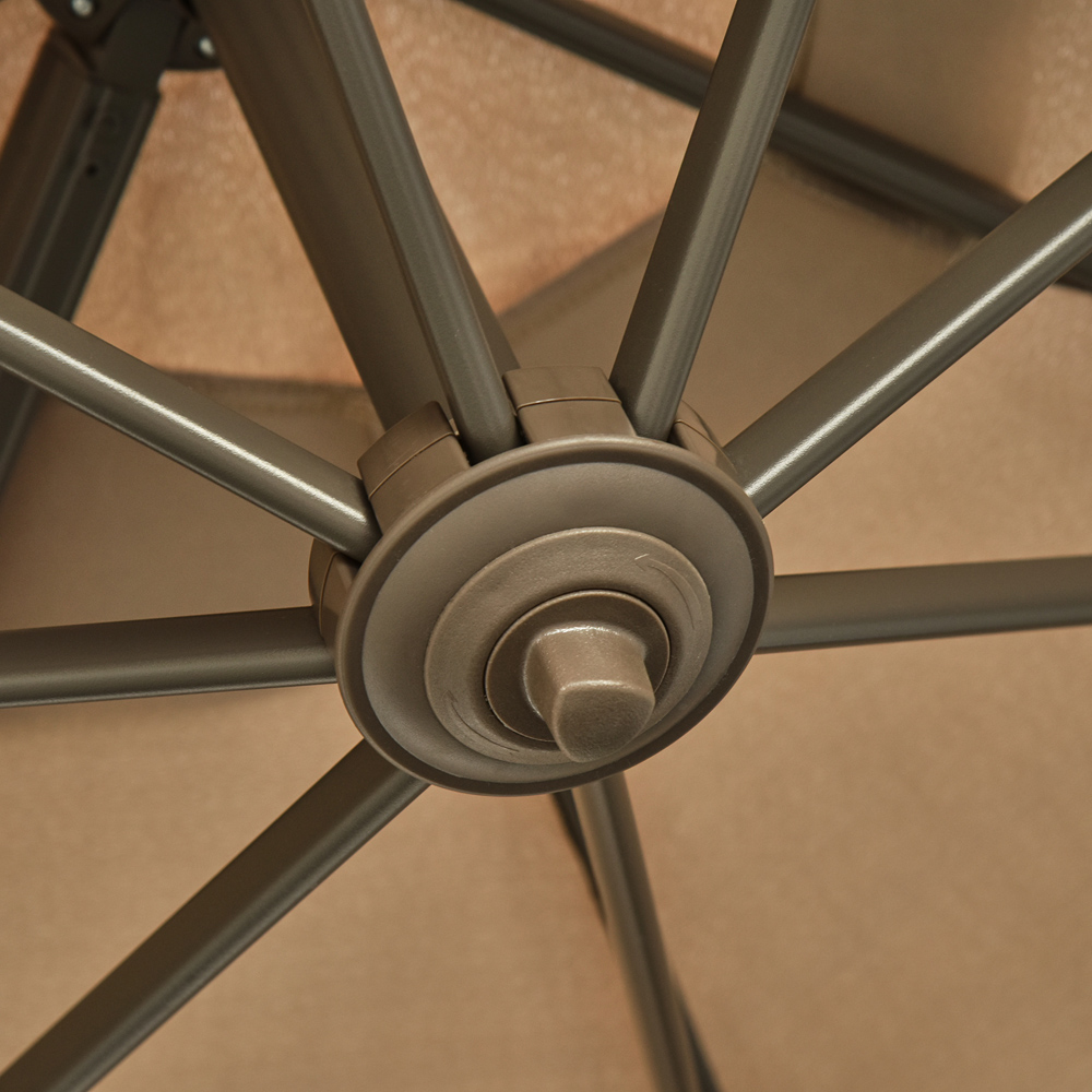 This Outsunny Tilting Cantilever Parasol in khaki is a great solution for your outdoor living. With a large 3 x 2.5m span, it can cover a large area, giving you enough shade from the sun. The pole is strong and has eight ribs that firmly extend the canopy with ease. The crank mechanism allows you to open and close the parasol quickly and easily, while the strap with hook and loop fastener makes it easy to organise. The umbrella can be angled in four positions and can also swivel for correct positioning. The canopy is designed with an air vent to add air circulation and resistance. Complete with a cross base and a foot pedal, the base offers a 360-degree rotation for easier shading area control. It's a great item to have as part of your outdoor living and will match any outdoor decor. Note: Only a cross base is included, no counterweight base. Looking for a way to keep your parasol secure and protected and enjoy some shade? Check out our selection of parasol bases, designed to keep your parasol in place while you relax and parasol cover to keep them protected.
