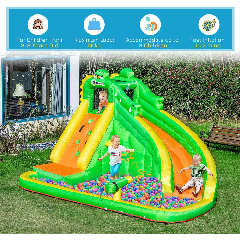 Transform your outdoor space into a thrilling play paradise with the Outsunny Kids Bouncy Castle with Blower! Designed with a fun layout and eye-catching design, this inflatable will be the highlight of the neighborhood. Packed with exciting activities, it features a slide, pool, basketball hoop, water gun, and climbing wall—keeping kids active and entertained for hours. Quick and easy to set up, the included high-quality electric air blower inflates the castle in just two minutes. Built for safety and durability, it comes with 10 ground stakes for stability and is crafted from weather-resistant high-density Oxford fabric, accommodating up to three children at once. For added convenience, it includes a carry bag for easy transport and two color-matched repair patches for quick fixes.