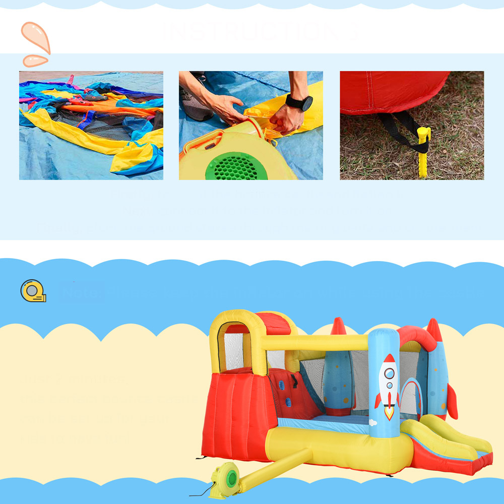 Give your little ones an out-of-this-world adventure with the Outsunny Kids Rocket Design Bouncy Castle! This inflatable playset comes with a high-quality electric air blower for quick and effortless setup. Designed for safety and stability, it includes five ground stakes, a convenient carry bag, and two color-matched repair patches for any unexpected mishaps. Crafted from water-resistant Oxford fabric, with durable 840D high-density material on the jumping and sliding areas, it comfortably accommodates up to four children at once. Featuring a trampoline, two slides, a climbing wall, and a pool, this bouncy castle guarantees endless fun and excitement!