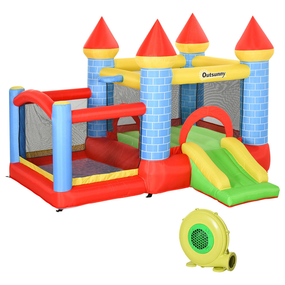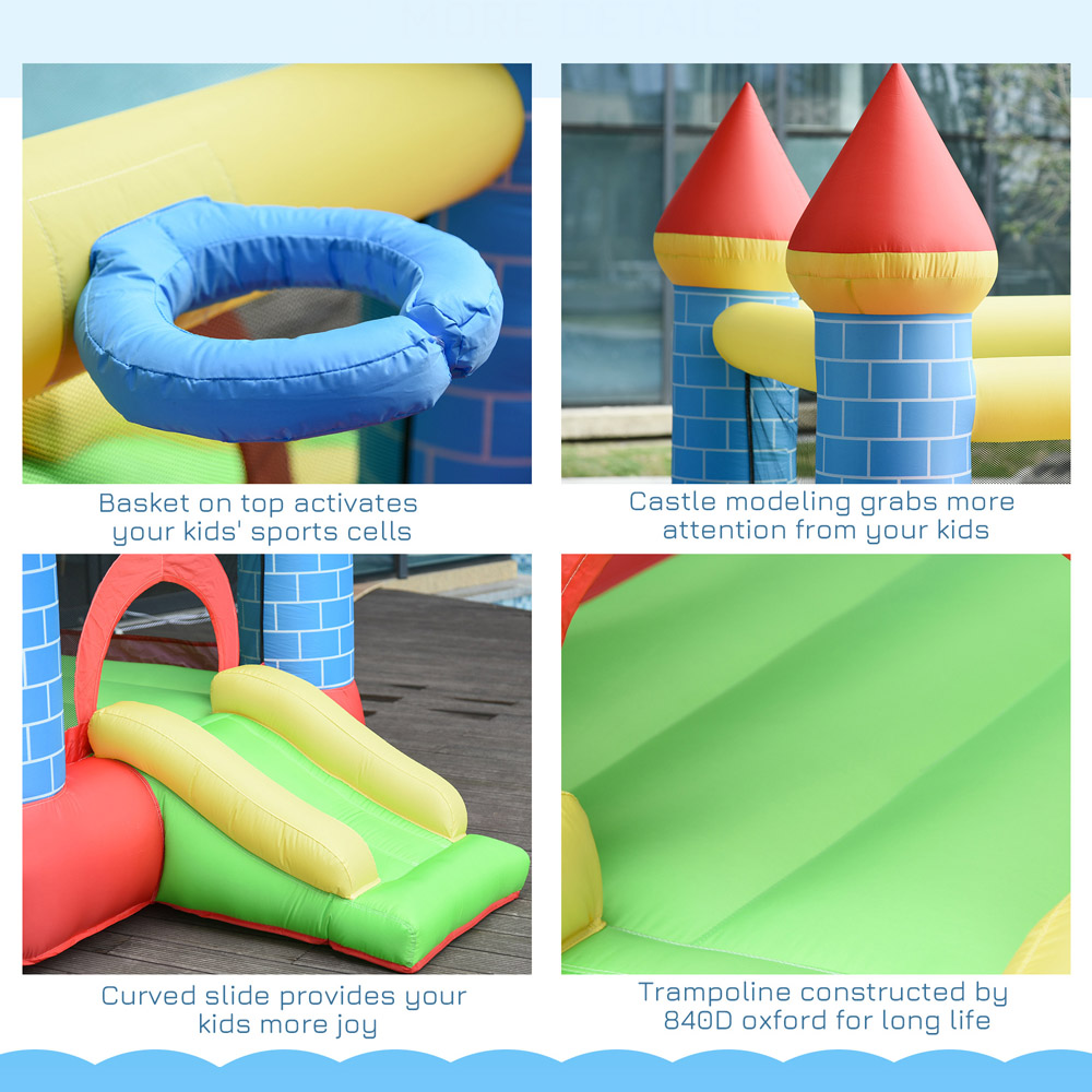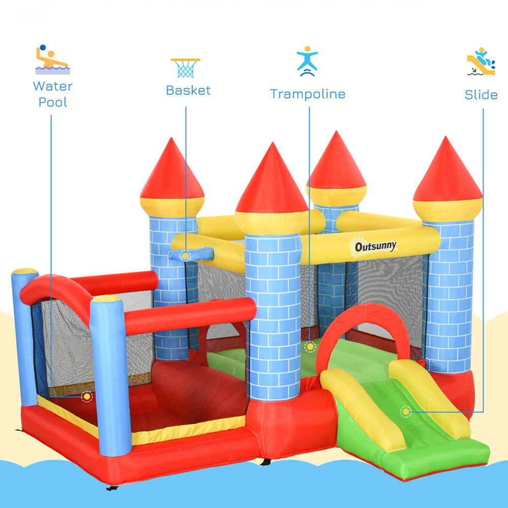 Elevate outdoor playtime with this incredible multi-activity bounce house that promises to keep kids entertained and active. Boasting a thrilling slide, a splash pool, a bouncy trampoline, and a basketball hoop, it creates a fun-filled atmosphere every child will adore. The included 350W electric air blower allows for rapid inflation in just 2 minutes, saving precious time. With safety as a priority, the inflatable features six secure ground stakes and is crafted from high-density, weather-resistant Oxford fabric, accommodating three children at the same time. A practical carry bag and colour-matching repair patches ensure easy transport and upkeep. This bounce house makes an ideal gift, helping children channel their energy into active play rather than screen time. Overall Dimension: H210 x W260 x L280cm. Dimension of Trampoline: W140 x L144cm. Dimension of Water Pool: W90 x L130cm. Dimension of Slide: W40 x L85cm. Dimension of Basket: Diameter: 20cm.
