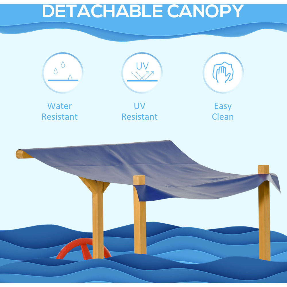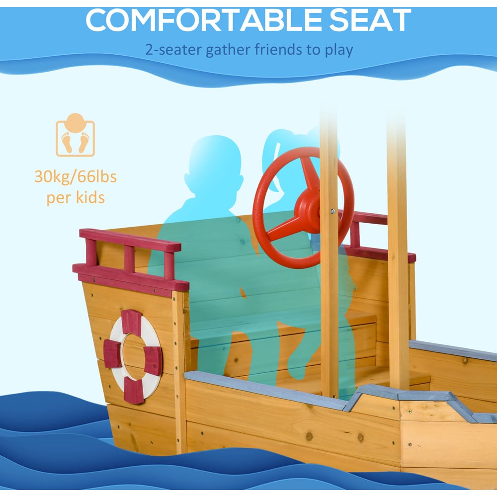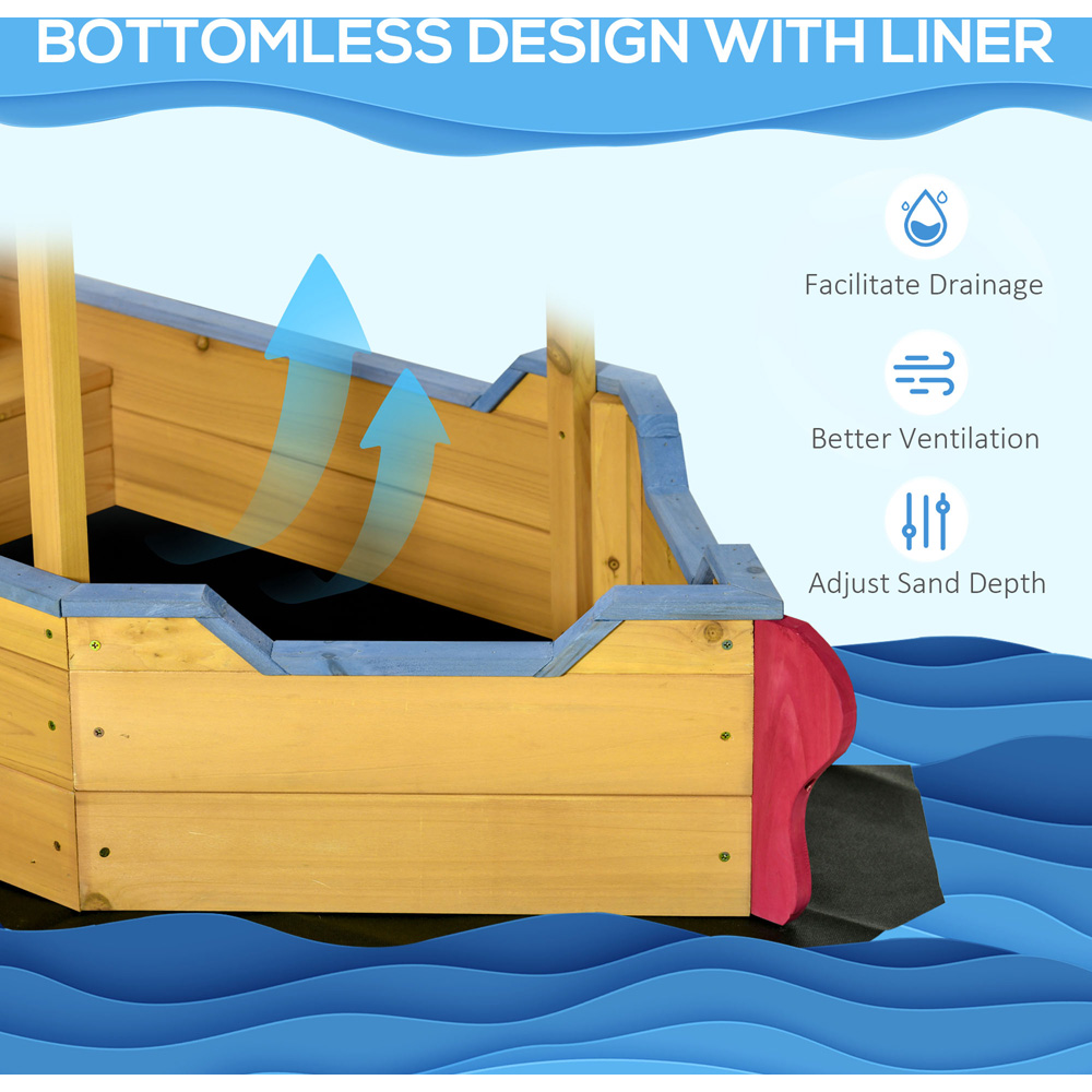 Give your little one a sailor-like feel with this Outsunny Kids Wooden Pirate Sandbox with Canopy. Featuring a bottomless design and removable liner, this sand pit stops sand from getting everywhere and is ideal for gardens. Great for playdates, it's incredibly spacious to fit multiple children at once - they'll play, dig and make sandcastles in a safe environment. For added convenience, the adjustable canopy offers protection from sun and rain. Moreover, the bench with storage provides a spacious seat and stores toys and accessories underneath. Plus, the smooth surface lowers the chance of accidents happening.