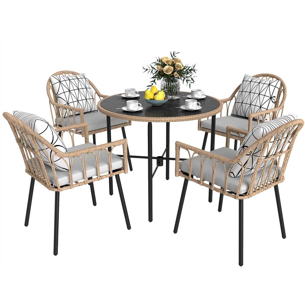 Create a tranquil outdoor retreat with the Outsunny five-piece patio set. Featuring a timeless rattan design, this garden table and chairs offer both style and comfort to your outdoor dining area. Sink into relaxation with soft cushions and a cushion, designed for enhanced comfort. The table features a beautiful and durable tempered glass top with a stone effect. Suitable for any garden setting, this set transforms your outdoor space into a haven of relaxation.