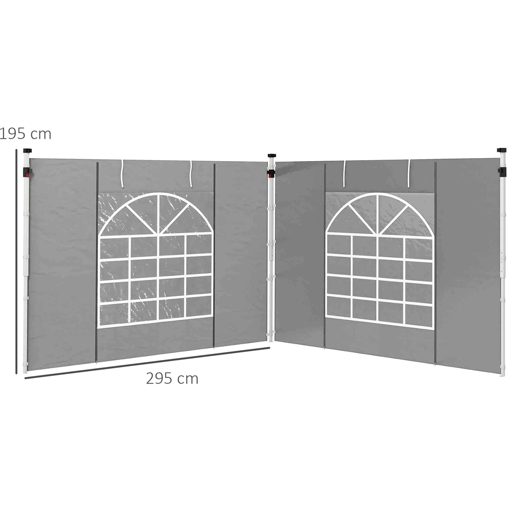 Designed to fit most 3 x 3m or 3 x 6m canopies, these Outsunny Gazebo Side Panels give outdoor canopy tents a new lease of life. The set includes two walls in light grey made from thick 210D Oxford cloth - suitable for outdoor use. Both walls feature a window to allow light through and a door to go in and out easily. Each side panel comes with a zipped door to enjoy the breeze and for quick entry. They also have double-layer middle windows which roll up to let in lots of light and provide unobstructed views. Complete with the straps, it is super easy to use and attach. Please note that only walls are included (the gazebo frame is not included).