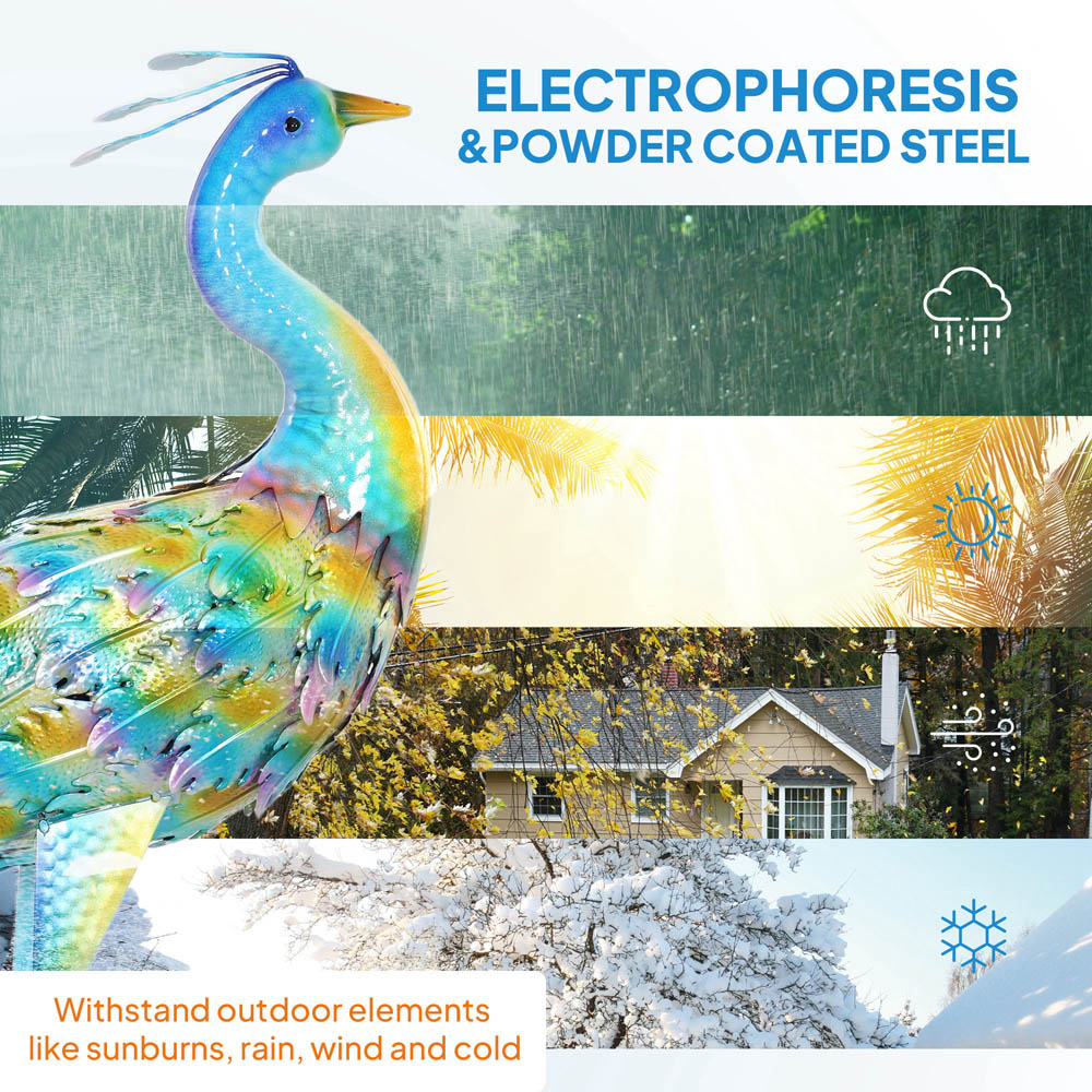 Add a splash of colour to your garden with this Outsunny garden art sculpture. Built to endure the rigours of outdoor life, this metal statue boasts vibrant hues and intricate detailing. Electrophoresis and powder coating treatments ensure lasting durability, whilst the included U-shaped ground stakes provide enhanced stability.