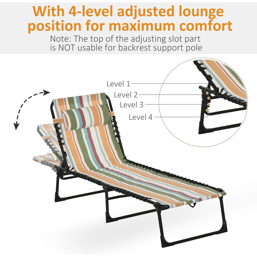 Upgrade your outdoor space with the Outsunny Multicoloured Four-Level Adjustable Folding Sun Lounger. This lounger is ideal for you at the beach, on the patio, near the swimming pool or at the camping ground. You can sit up, recline or lie down in four different reclining positions. This portable sun lounger is made of a powder-coated steel frame that guarantees a stable standing, and the 100% plastic fabric with a double elastic rope suspension system provides a comfortable yet firm support. It is easy to transport, so you can toss it in your trunk and have a comfy place to rest anywhere. Protect your garden furniture with our durable and waterproof covers. Explore our wide range of heavy-duty Garden Furniture covers to find the perfect fit for your needs.