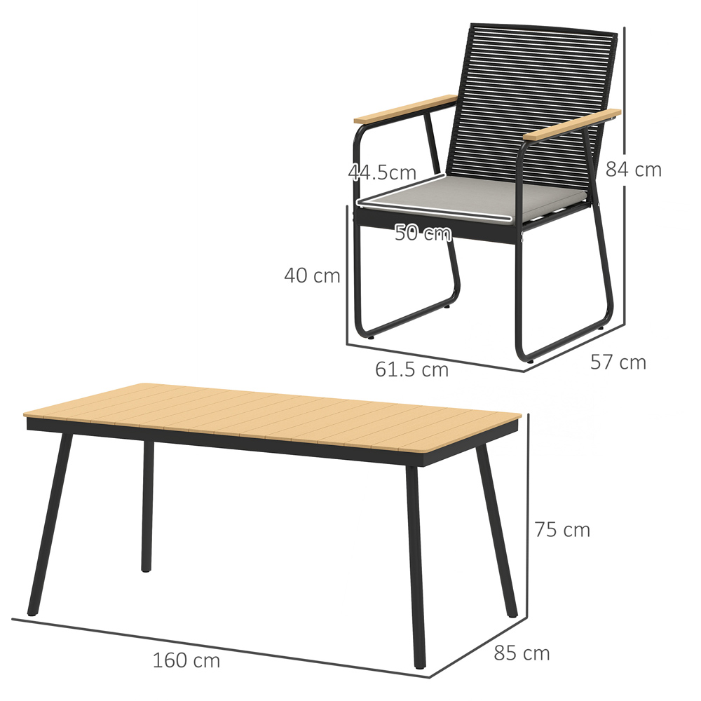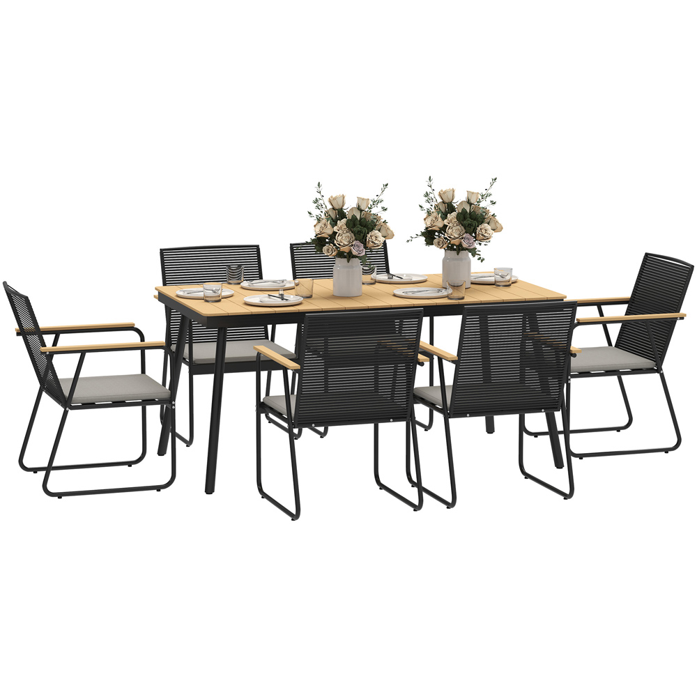 Elevate your outdoor dining with this elegant Outsunny six-seater garden set. Designed for both comfort and resilience, each chair features a sumptuously padded cushion, perfect for long, leisurely meals. The wood plastic composite tabletop offers exceptional resistance to weather damage, ensuring lasting beauty and practicality. Blending modern style with everyday functionality, this set transforms any outdoor meal into a memorable occasion.