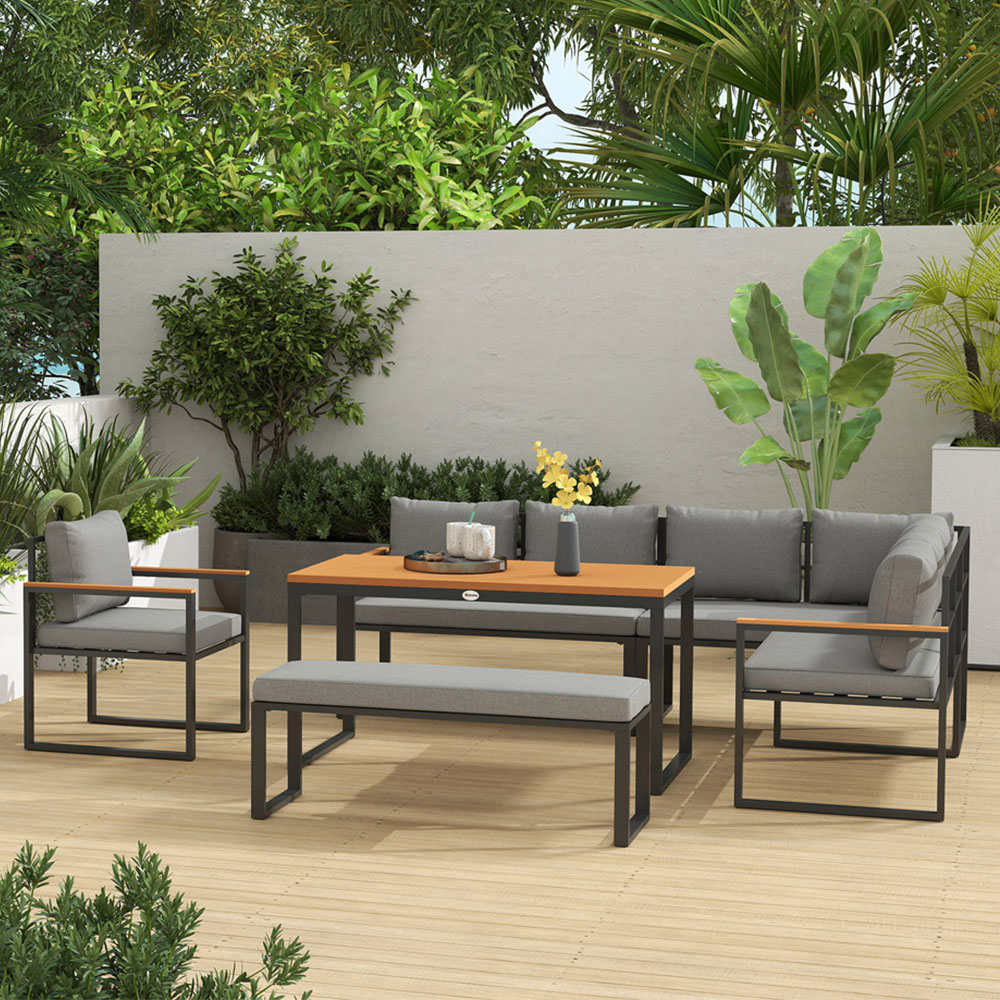 Craft a tranquil outdoor retreat with the Outsunny corner garden furniture set. This versatile conservatory furniture arrangement features three loveseats, an armchair, a coffee table, and a bench that doubles as a footstool. Each piece is crafted for comfort, boasting thick cushions and generous seating areas. Customise the layout of this garden lounge set to perfectly complement your patio or balcony, making every outdoor experience a moment of pure relaxation. This set provides ample space for you and your guests, ensuring every outdoor moment is a breath of fresh air.