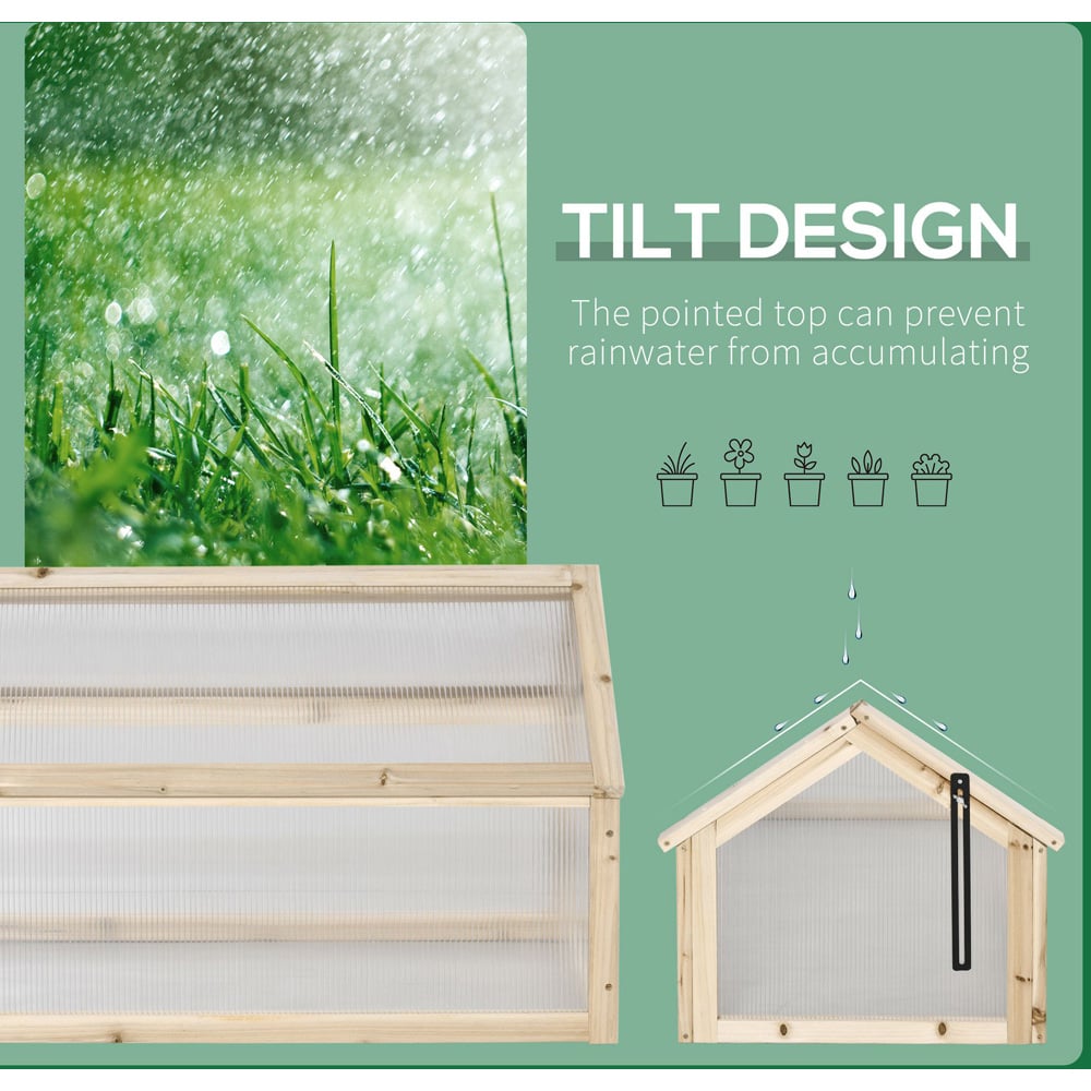 Cultivate flourishing plants and vegetables with the Outsunny Natural Wooden Polycarbonate Greenhouse (1.6 x 3ft). Its robust wooden frame ensures lasting stability, while transparent polycarbonate panels maximise sunlight penetration for optimal growth. The cleverly designed roof vent provides excellent ventilation and easy plant access. Extend your growing season, shielding delicate seedlings, crops, and flowers from harsh weather. The sloped design ensures efficient water run-off, preventing pooling and potential damage. This compact greenhouse offers a controlled environment, promoting healthy growth year-round. The maximum roof angle is 80 degrees, allowing for efficient air circulation.
