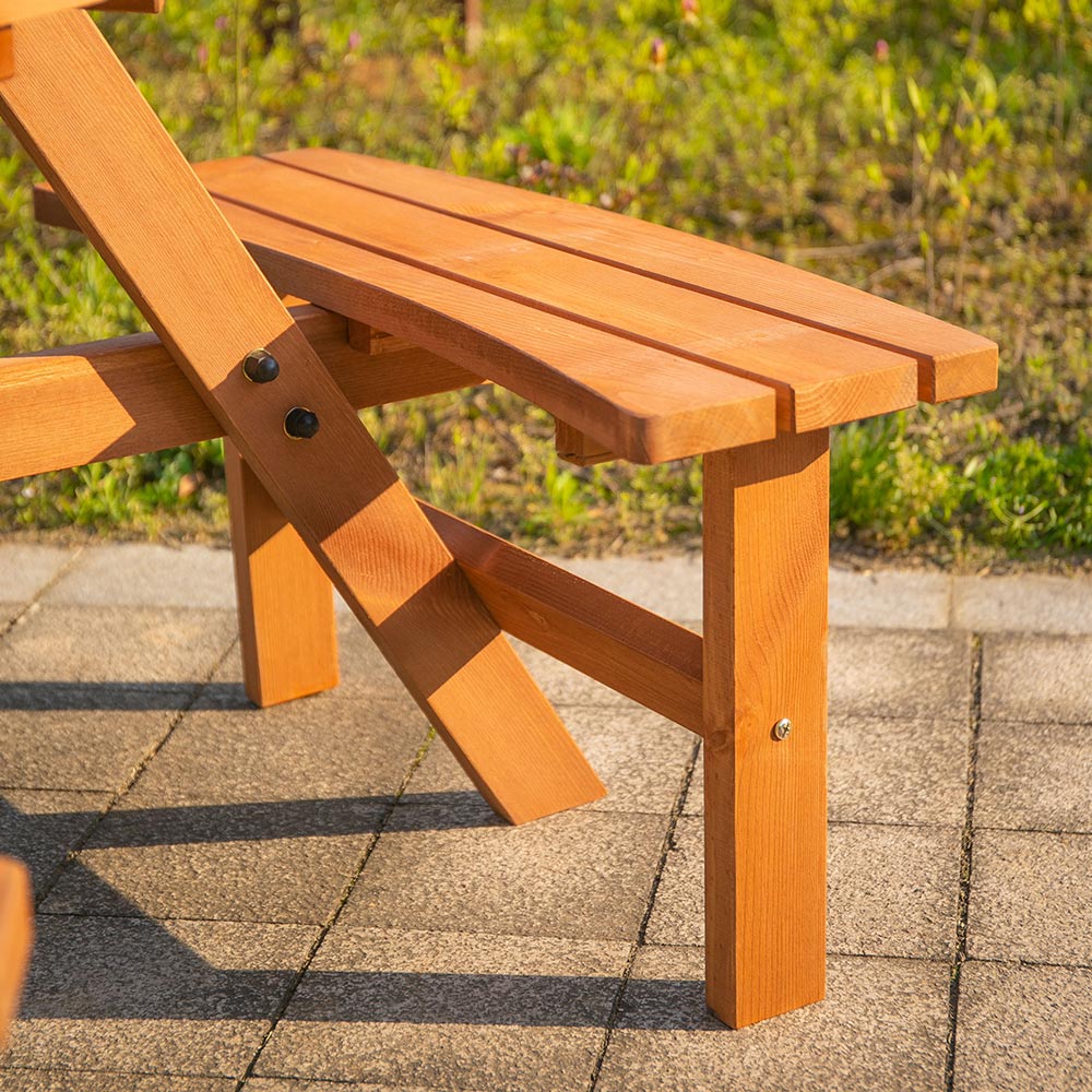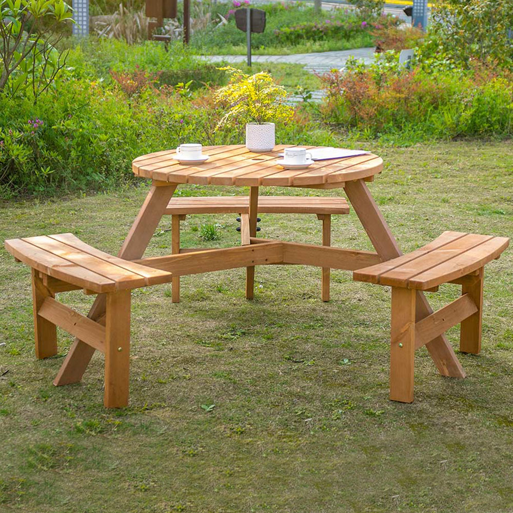 Create a welcoming outdoor space with this four-piece wooden set. This circular design features a table and three attached chairs, comfortably seating six around ample space for food and drinks. Crafted from durable fir wood, the set',s stability is further enhanced by cross-bars between the chair legs. A central parasol hole in the table offers welcome shade. Perfect for gardens and patios, this set is built to last. Extend its life with one of our durable, waterproof garden furniture covers.