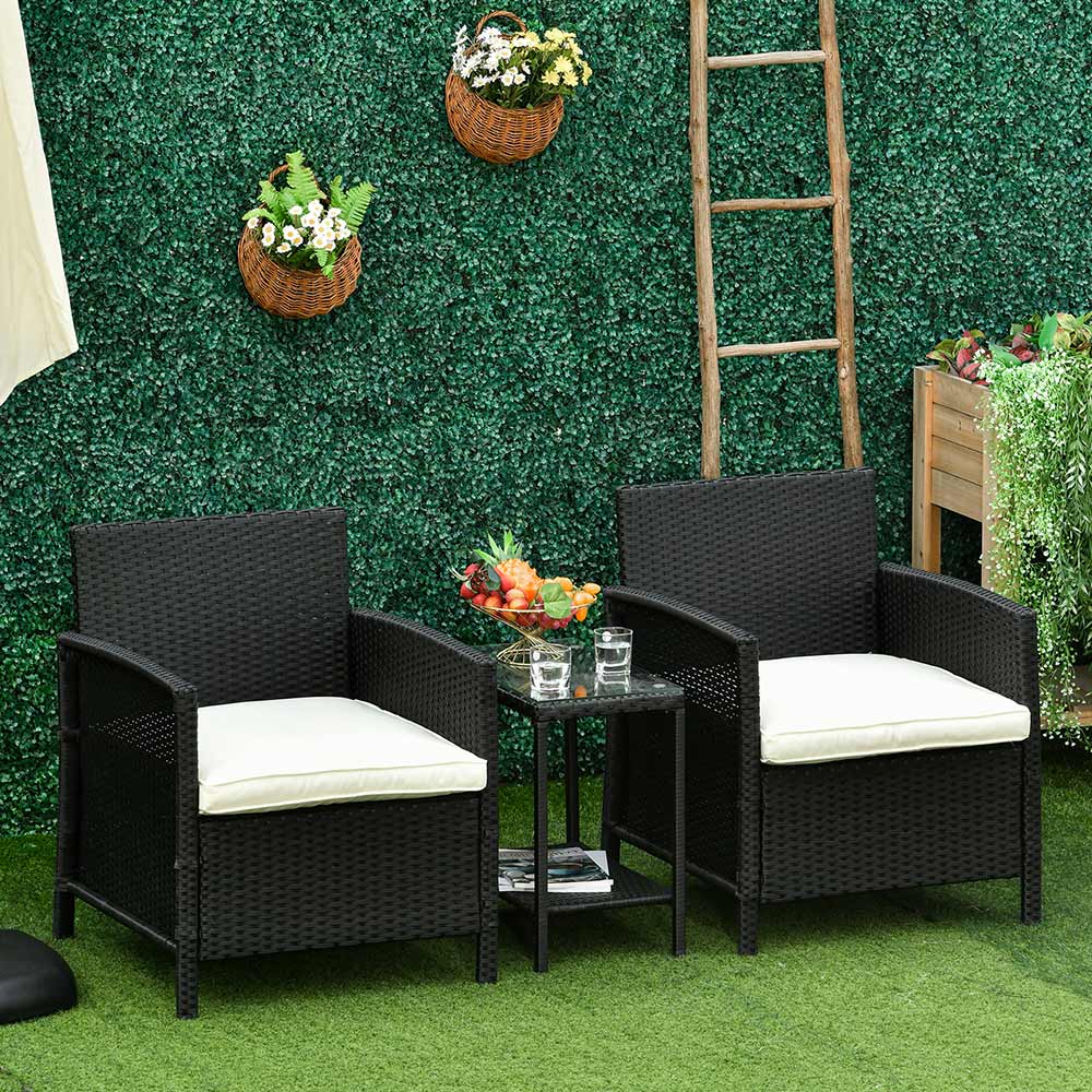 Make the right choice for the upcoming Summer season – choose this three-piece dining set from Outsunny for endless hours of comfort and joy. The garden bistro set for two, made of powder-coated, rust-resistant steel, ensures a strong and stable base. The PE wicker makes it sturdy, durable, easy to clean and resistant to UV and light water damage. The rattan two chairs and table set are placed with thick cushions on the seat for prolonged comfort, with removable and washable covers to keep them clean. And a stylish striped bolster cushion on each seat for extra comfort and support. The set is completed with a matching two-tier table, with a tempered glass top for a chic finishing touch. This garden bistro set featuring two wide armchairs and a matching coffee table is perfect for relaxing under the sun with someone, in your garden, on your patio, on the balcony etc. Protect your garden furniture with our durable and waterproof covers. Explore our wide range of heavy-duty