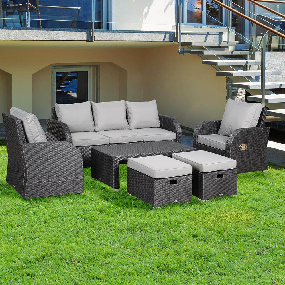 Transform your outdoor living space into a luxurious retreat with this Outsunny 7 Seater Grey Rattan Wicker Lounge Set. Featuring two versatile reclining armchairs, a spacious three-seater sofa, two stylish footstools, and a chic matching table, this collection offers the ultimate in relaxation and style. The armchairs smoothly adjust from 90° to 130°, allowing you to find your perfect lounging position while enjoying gatherings or outdoor entertainment. Built to last, the robust powder-coated steel frame is elegantly wrapped in UV and water-resistant rattan, marrying durability with refined aesthetics ideal for high-end outdoor settings. Designed with families in mind, the padded cushions come with removable and washable covers, ensuring both comfort and easy upkeep for those who cherish quality time outdoors. For optimal organisation, the footstools conveniently nest under the table, keeping your space tidy and clutter-free. 3 Seat Sofa Size: H73 x W172 x D67cm. Seat Size: W156 x D57cm. Single Recliner Size: H81 x W75 x D69cm. Seat Size: W59 x D51cm. Seat to Floor Height: 30cm. Coffee Table Size: H38 x W52 x L112cm. Footstool Size: H30 x W52 x L46cm. Weight Capacity: 160kg/per seat, 70kg(Table).