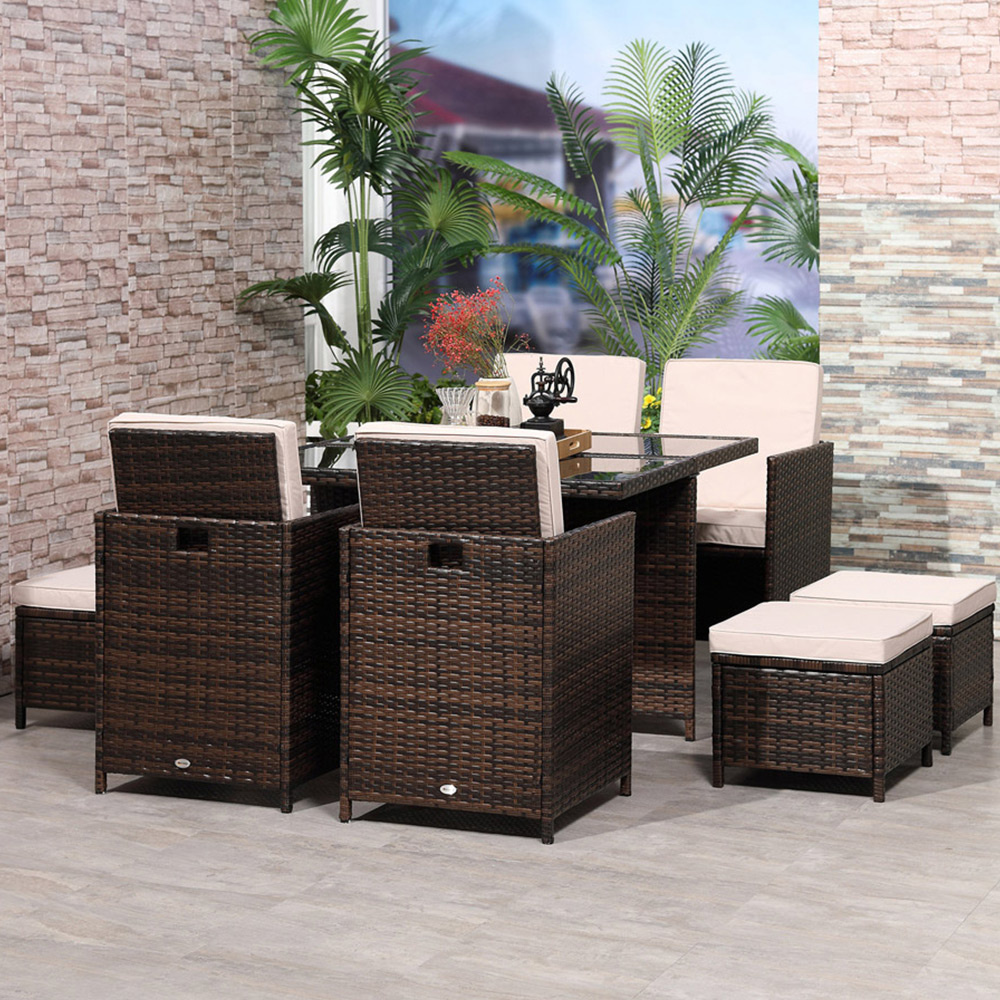 Enjoy dining under the stars on this Outsunny Rattan 8-Seater Garden Dining Set. This brown rattan set is suitable for use on any occasion. Its wicker and tempered glass table combination looks fashionable and creates a modern style for your living area. Also, it complements a range of outdoor space for you. Featuring a space-saving design, the chairs and stools nest neatly under the table for compact storage when not in use. Plus, it has a strong and supportive core with protective plastic wrap on top. For comfort, the rattan table, chairs and stools come complete with cushions for you to sink into easily. This set includes four armchairs, four footstools and a dining table. Protect your garden furniture with our durable and waterproof covers. Explore our wide range of heavy-duty Garden Furniture covers to find the perfect fit for your needs.