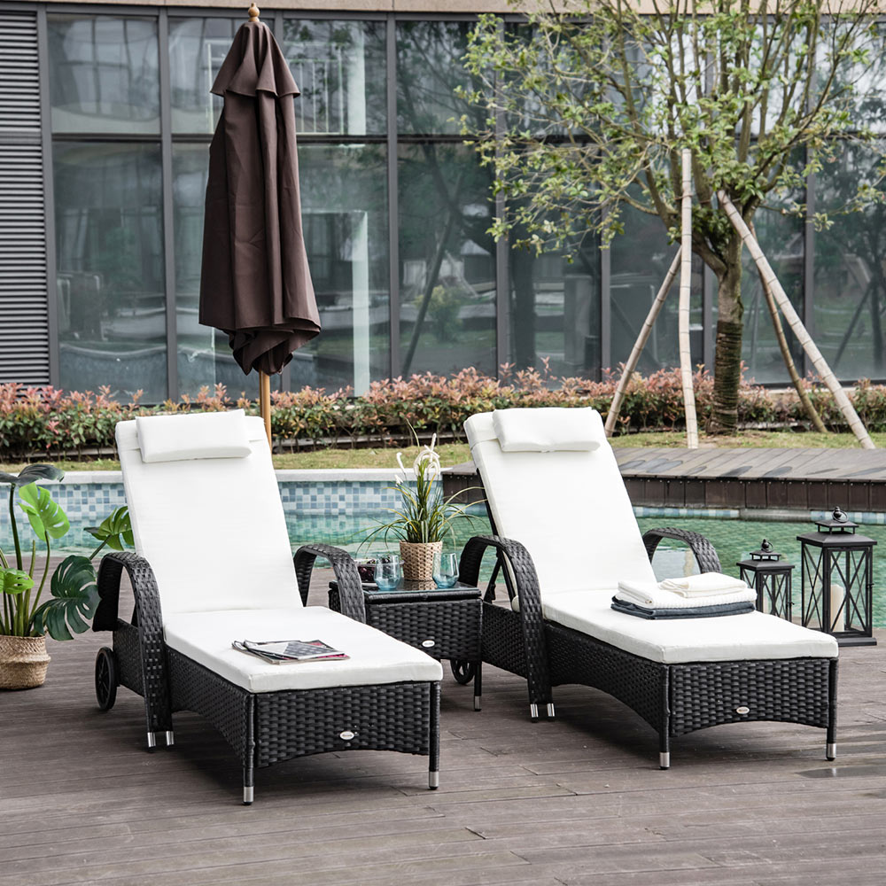 Introduce a touch of relaxation to your garden with this rattan patio chaise lounge set from Outsunny, complete with two loungers, a side table, and comfortable cushions. Each lounger offers five adjustable positions, allowing you to find the perfect angle for ultimate comfort and relaxation. The included side table features a glass top, ideal for keeping refreshments close at hand, and the set is equally suited for indoor or outdoor use. Crafted from durable, all-weather PE wicker on a resilient steel frame, these outdoor lounge chairs are designed for easy maintenance. Enhanced with quality polyester fabric cushions and foam padding, these pool chaise loungers offer superior comfort. The backrests adjust to five different angles, ranging from 30-103 cm, catering to your individual relaxation preferences. These outdoor lounge chairs are built from durable all-weather PE wicker on a weather-resistant steel frame and are easy to maintain.