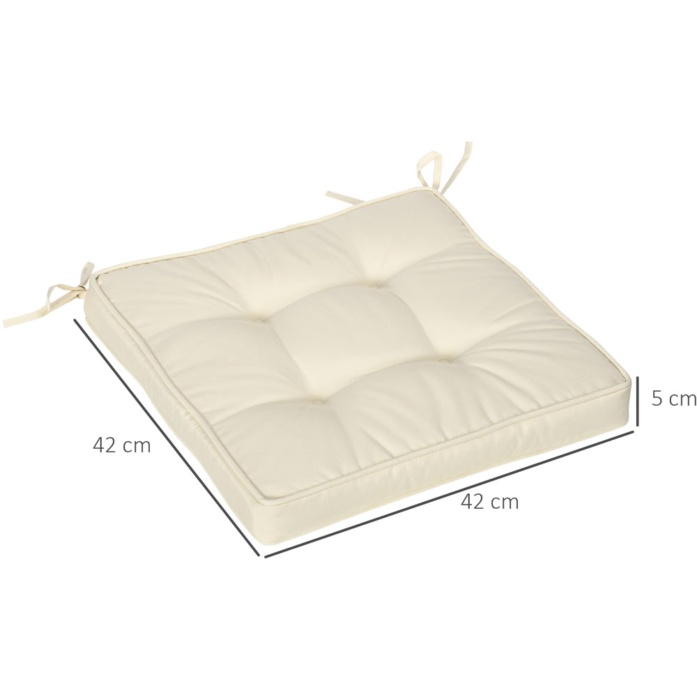 Make your outdoor chair surface nice and comfortable with Outsunny Cream Garden Seat Cushion. Made from 180gsm polyester - they are durable and tough, providing reliable use indoors and outdoors. It features two different types of filling, which ensures resilience and softness, props you up, and allows you to sit for hours at a time. Perfect for refreshing your home instantly - it's finished with two tie fastenings to stay in place on the seat. Specifications: Colour: Cream White, Material: Polyester, Overall Dimension: 42 x 42cm. Care and use: Spot clean or hand wash with mild soap and cool water, drying naturally outdoors.