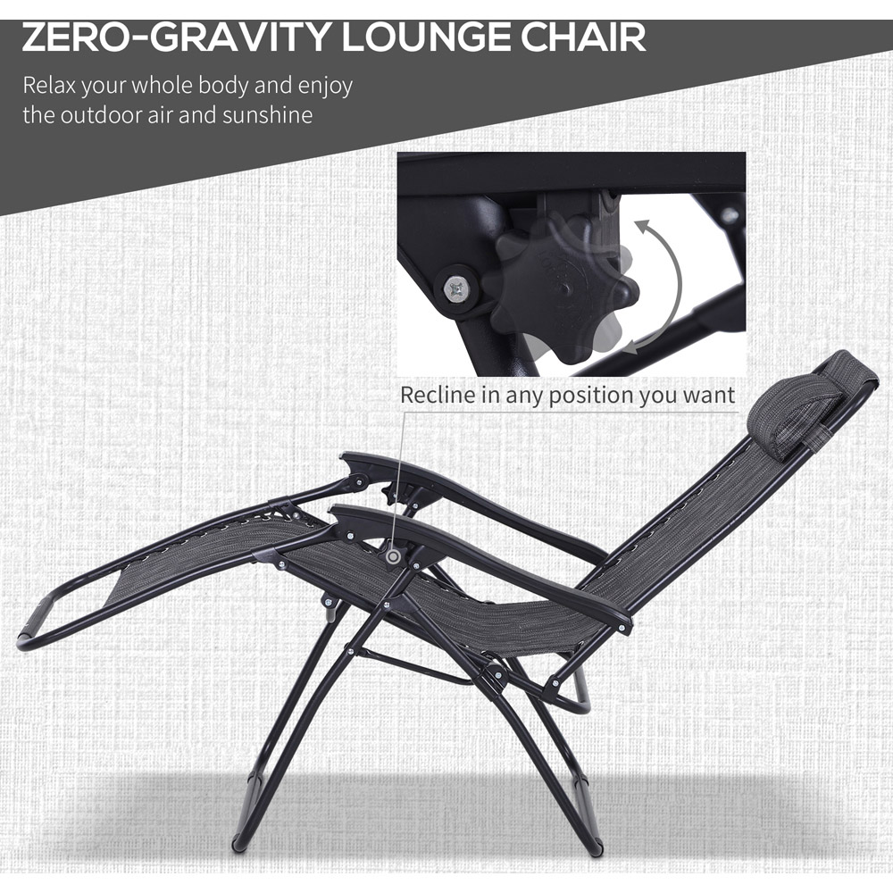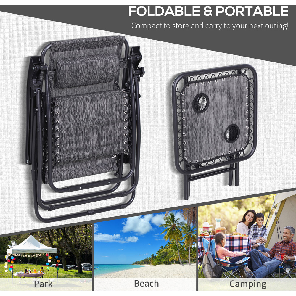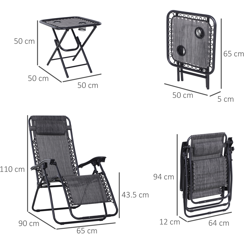 Unwind and let your worries fade away with this Outsunny Set of 2 Light Grey Zero Gravity Folding Recliner Chairs with Table. Designed for ultimate comfort, these patio recliners feature a powder-coated steel frame with a curved silhouette and a padded headrest to keep you comfortable and relaxed. Their foldable design ensures effortless portability and storage. The smooth recline mechanism locks securely into your preferred position, while the integrated headrest and contoured armrests provide enhanced support and comfort. Ideal for patios, campsites and other outdoor spaces. A convenient side table completes the set.