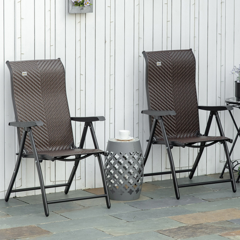 For stylish and comfortable outdoor seating, get the Outsunny Set of 2 Red Brown Rattan Folding Garden Chair. Made with steel frames for strength and wrapped in durable plastic rattan wicker, these chairs are perfect for relaxing or eating outside. The chairs can be easily folded for storage and transport, and they will complement any outdoor furniture. This set includes two armrest chairs that can be arranged in various configurations to fit any outdoor space, such as patios, gardens, balconies, or swimming pools. The steel frames have a powder-coated finish for extra strength, and the chairs come with adjustable backrests that can be set to seven different reclining angles. Don't miss out on these versatile and stylish chairs that will enhance any outdoor space. Protect your garden furniture with our durable and waterproof covers. Explore our wide range of heavy-duty Garden Furniture covers to find the perfect fit for your needs.
