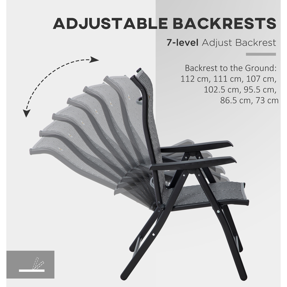 Upgrade your outdoor space with the Outsunny Set of 4 Black and Grey Rattan Folding Garden Chair. The powder-coated steel frame provides a sturdy foundation, while the plastic wicker adds durability and style. With tall backs and armrests, plus a comfortable seat, you'll be able to relax in total comfort. Whether standing alone or paired with other furniture, this set is the perfect addition to any garden, patio, or outdoor area. Features seven-position adjustable backs from the ground: 73cm, 86.5cm, 95.5cm, 102.5cm, 107cm, 111cm and 112cm. Choose the most comfortable position. Don't wait - start your season off right with this stylish and practical rattan armchair set. Protect your garden furniture with our durable and waterproof covers. Explore our wide range of heavy-duty