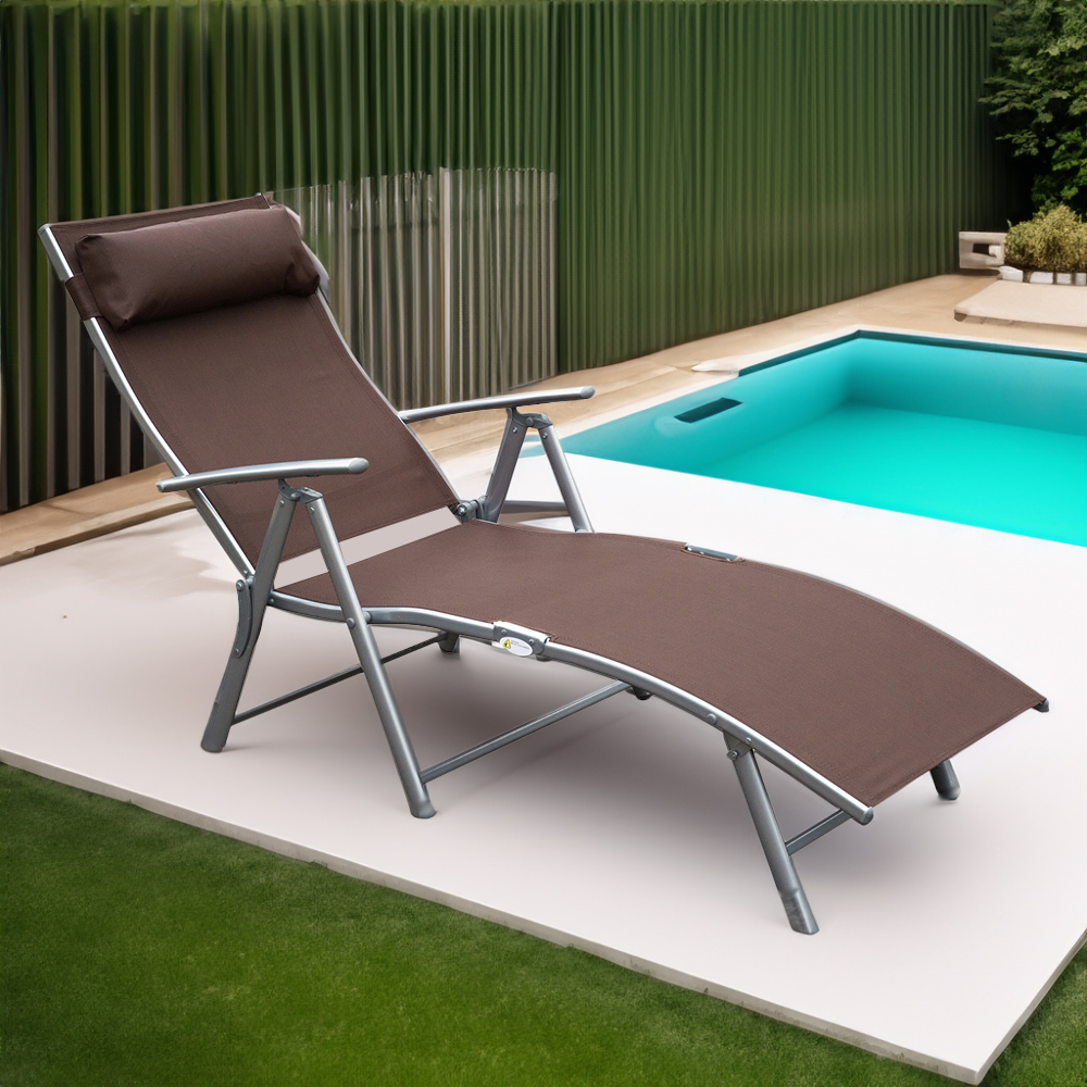 Enhance your garden or backyard with this beautiful brown reclining garden chair from Outsunny. Offering effective relaxation, this sun lounger is crafted with a robust steel frame and durable 560g/m2 texteline material. Its strong design supports up to 165kg. The lightweight, foldable design ensures convenient transportation and storage. The outdoor recliner features a five-level adjustable backrest and a thick PP cotton-filled pillow for enhanced comfort. Ideal for relaxing on your patio, beach, park, deck, pool, or backyard. Its portability makes it a great system for relaxation.