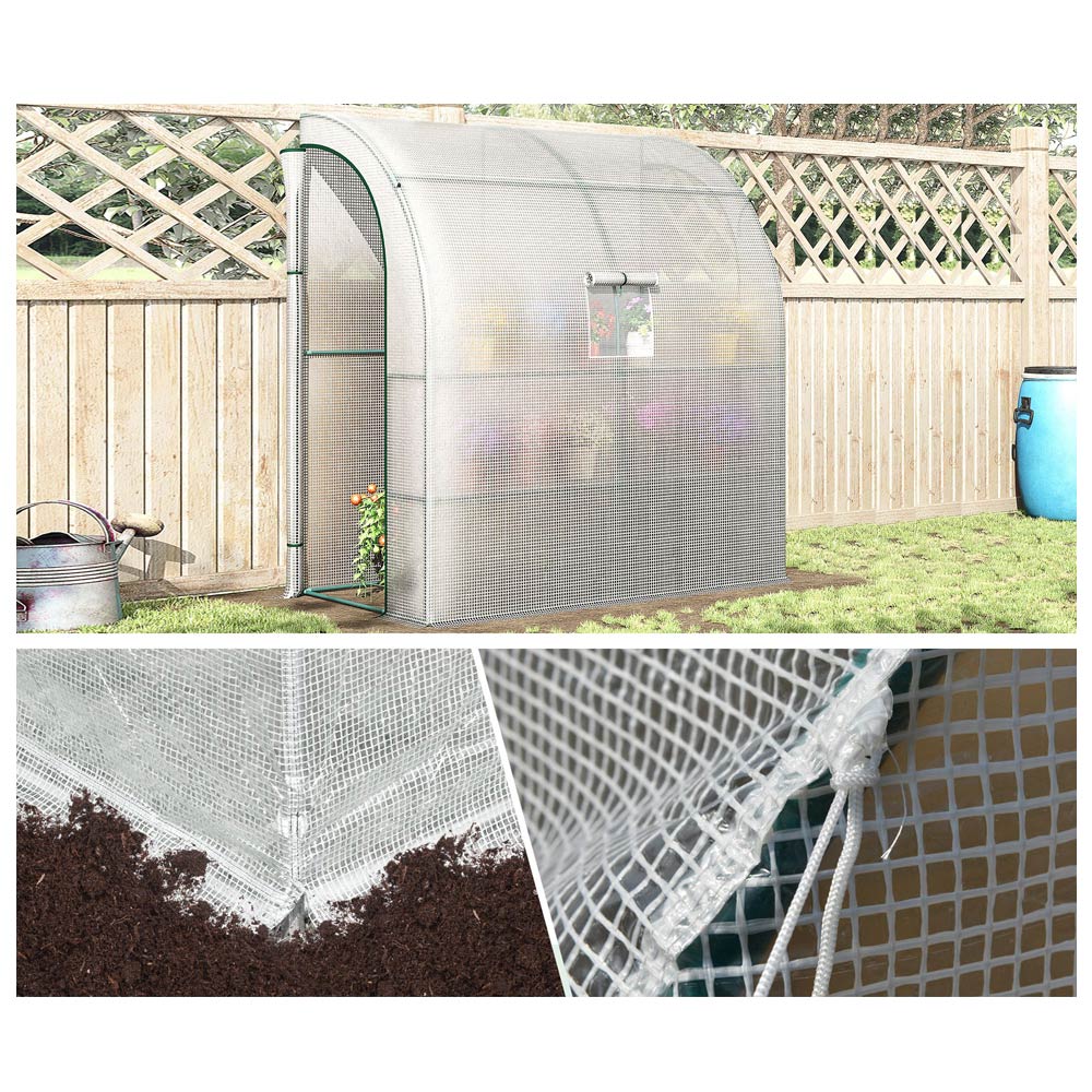 This Outsunny walk-in greenhouse lets you garden all year round. Protect your plants from extreme weather in this secure haven, perfect for vegetables, fruits, herbs, and flowers. Its sturdy frame uses rust-resistant powder-coated steel tubing and a durable grid-pattern plastic cover. Four shelves and four wired panels provide plenty of space for healthy plant growth. An extra-long cover creates an airtight seal, further secured by burying the base. Conveniently place it next to your home, garage, or shed. Strong guy ropes and stakes ensure stability.