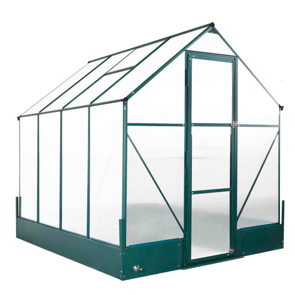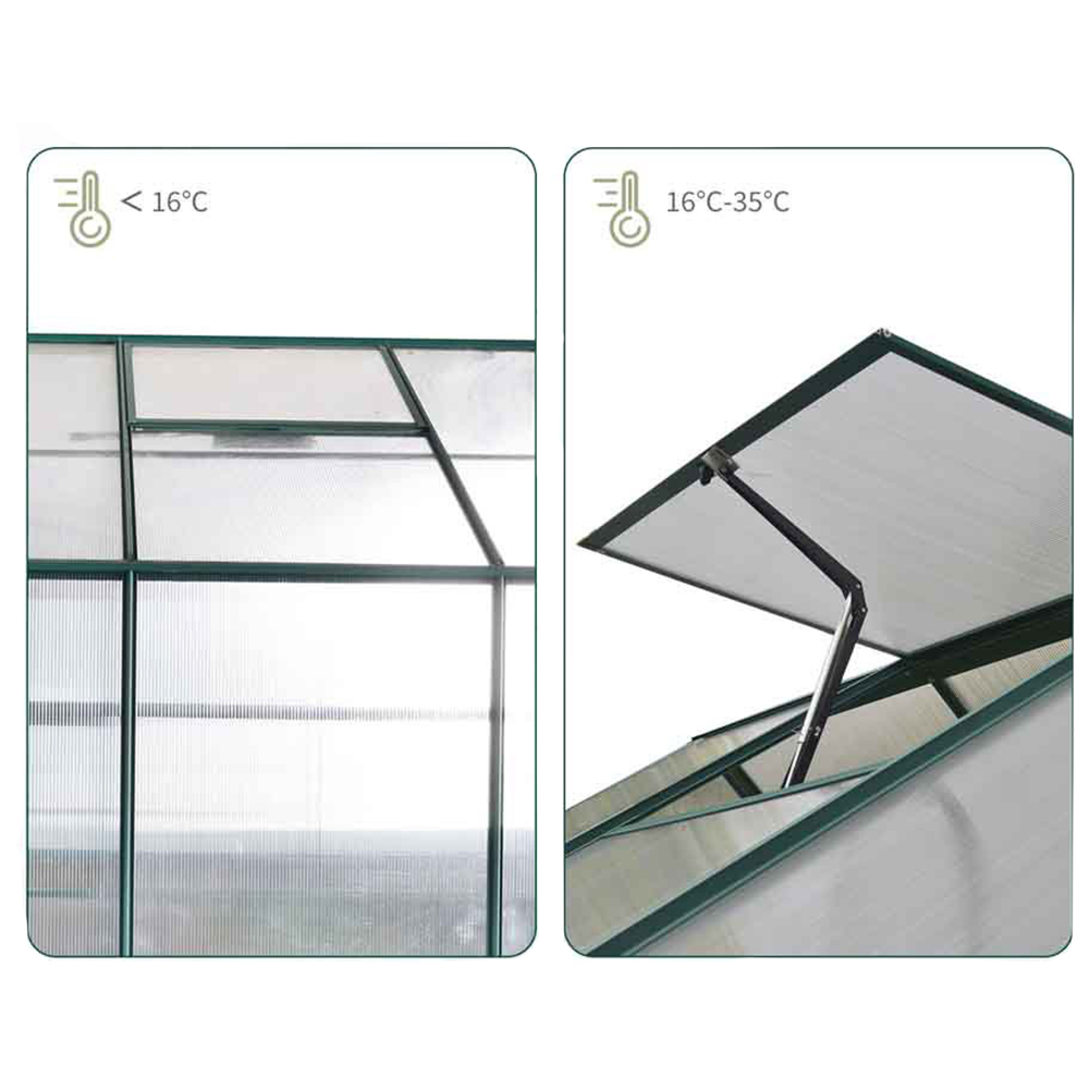 Grow more with the Outsunny Walk-in Greenhouse! This spacious 6 x 8ft greenhouse boasts a robust, rust-resistant aluminium frame and durable polycarbonate panels with UV 30um resistance, shielding your plants from harsh sunlight while allowing essential light penetration. A smart, temperature-controlled window automatically adjusts ventilation, and two integrated garden beds simplify plant management.