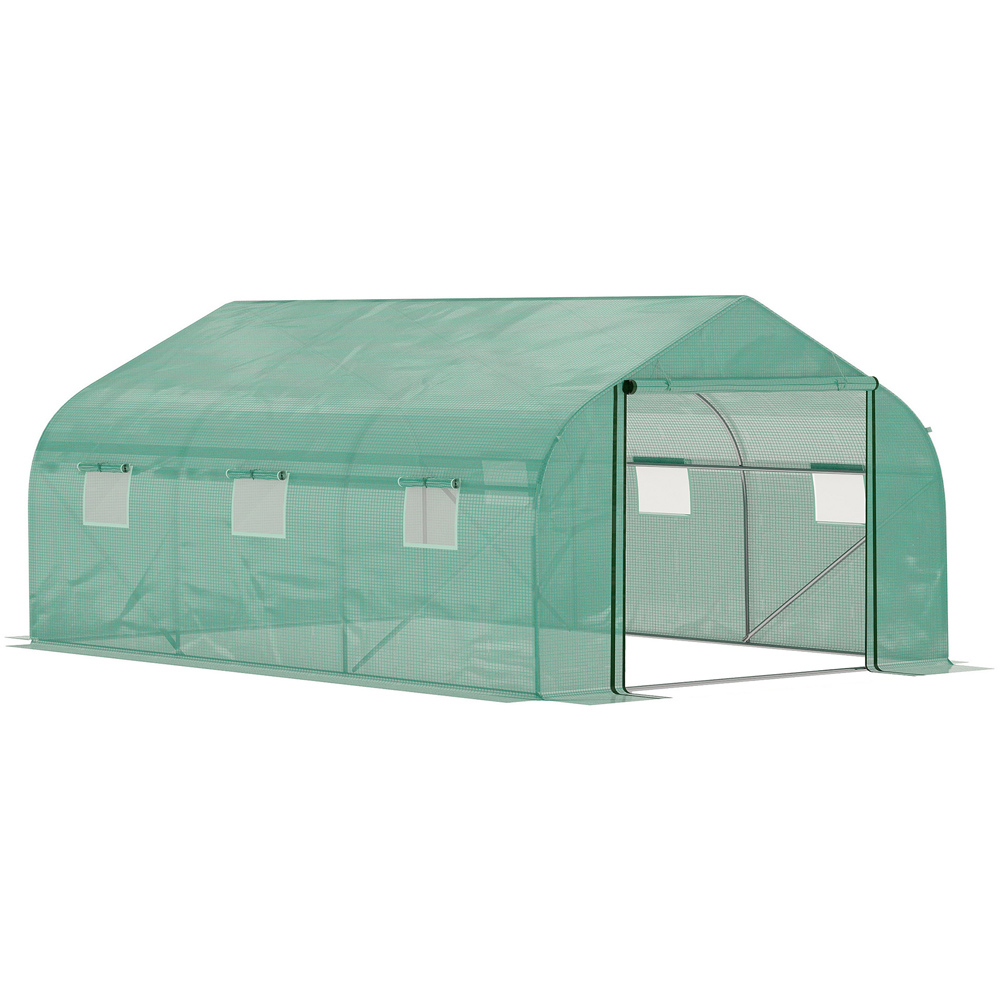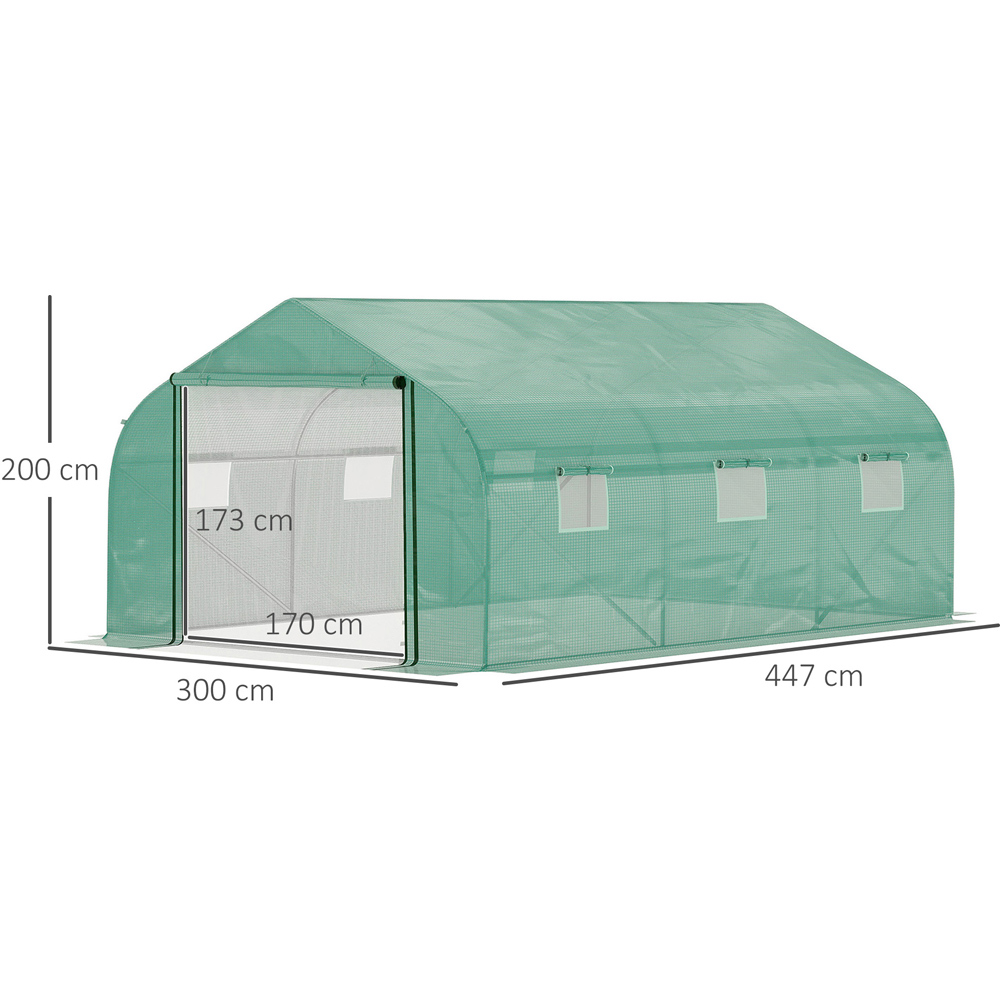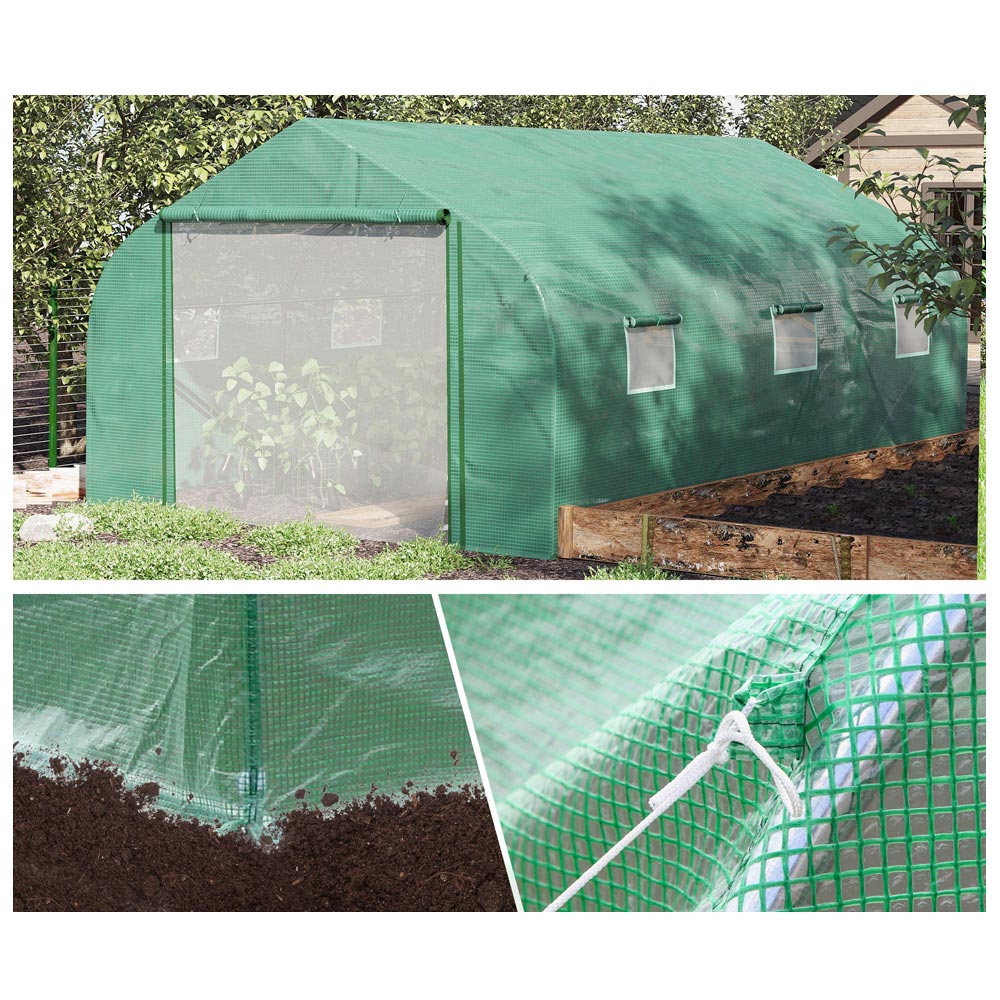 The Outsunny 15 x 10ft Walk-in Greenhouse is a gardener',s dream, providing ample space to cultivate a thriving garden throughout the year. Its robust design protects plants, vegetables, and flowers from the elements. A zipped mesh entrance keeps out small animals, while six roll-up mesh windows ensure proper ventilation and temperature regulation. Four guy ropes and ground pegs offer enhanced stability. Important: Do not leave the greenhouse standing during heavy weather.