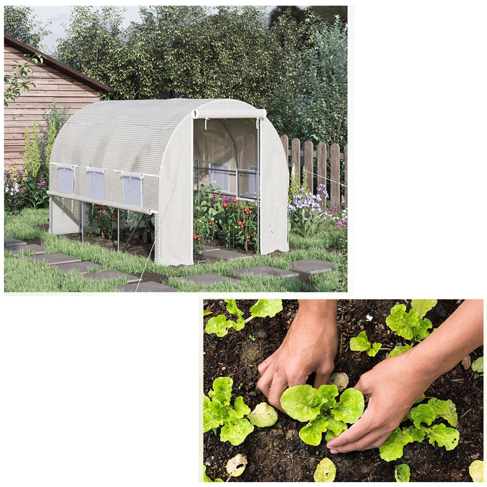 Grow more, all year round, with this Outsunny portable greenhouse! Its sturdy steel frame, complete with ground stakes and guy ropes, guarantees stability. Inside its spacious 9.5 x 6.5ft area, cultivate an abundance of plants, flowers, and vegetables. Enjoy the freedom of an open design, personalising your interior to perfection. Roll-up doors and windows provide easy access and ventilation, complemented by a secure zipped door. The protective PE cover shields your plants from wind and rain while letting in ample sunlight.