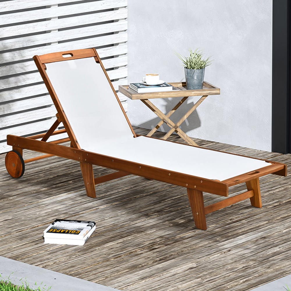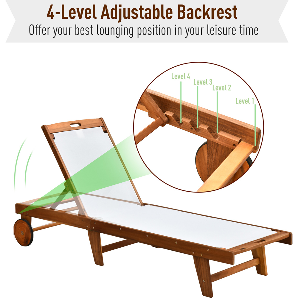 Outsunny White and Natural Acacia Wood Sun Lounger with Wheels