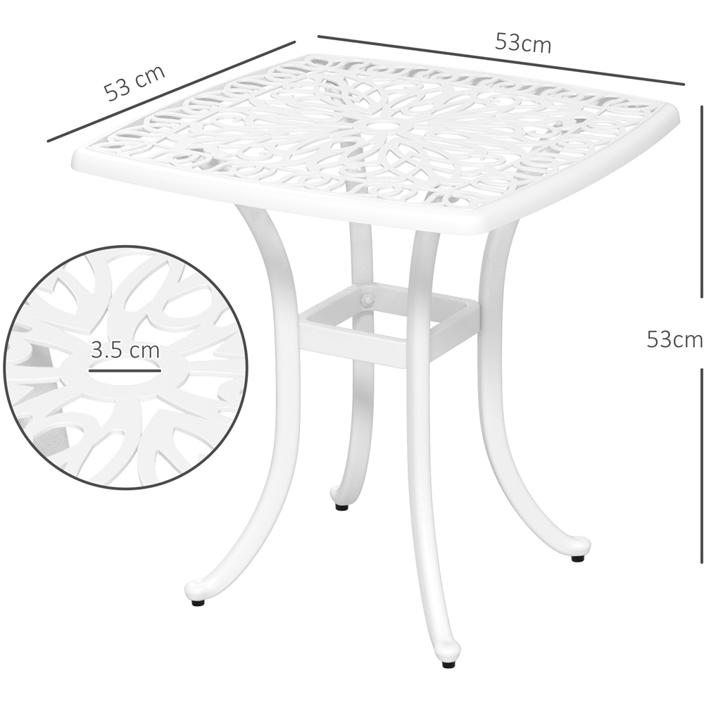Transform your outdoor space with this elegant bistro table. Its charming floral cut-out tabletop and gracefully curved legs create a beautiful focal point. Constructed from a robust cast aluminium frame with a durable powder-coated finish, this coffee table is built to withstand the elements year-round. A thoughtfully placed 3.55 cm central hole provides a secure fit for a parasol, ensuring you stay shaded in style.