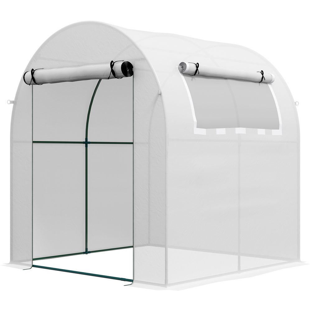 Create a haven for your plants with the Outsunny White PE Cover Walk-in Polytunnel Greenhouse. This robust structure boasts a steel frame, double-layered PE cover for durability, and secure guy ropes with stakes for ground anchoring. Enjoy convenient ventilation with the zipped roll-up door and side window, offering protection from light wind and rain. The design allows 85% sunlight penetration, fostering healthy plant growth, and its versatility extends to indoor use. With 10cm long edges for soil burial and generous dimensions of 180 x 180 x 200cm, it provides ample space for your collection.