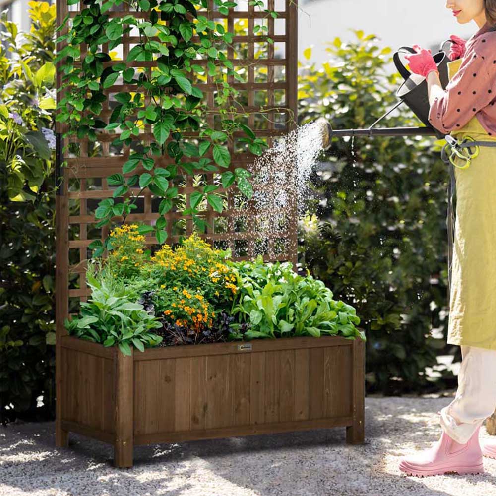 Maximize your gardening space with this Outsunny 2-in-1 planter and trellis. This versatile design features a spacious planter box ideal for flowers and plants, complemented by a sturdy trellis perfect for climbing varieties and vines. A convenient roof provides additional space for hanging baskets, while drainage holes in the base prevent waterlogging. Constructed from durable fir wood with a waterproof finish, it',s built to withstand outdoor conditions. The planter boasts a 50kg weight capacity (planter) and 5kg (top shelf), comfortably holding up to 79L of soil. Assembly is required. Overall dimensions are W 90 x D 45 x H 183cm. The internal planting area measures W 83.5 x D 38 x H 25cm. Trellis dimensions are W 90 x H 90cm and W 90 x H 57.5cm. The feet add 6cm of height.
