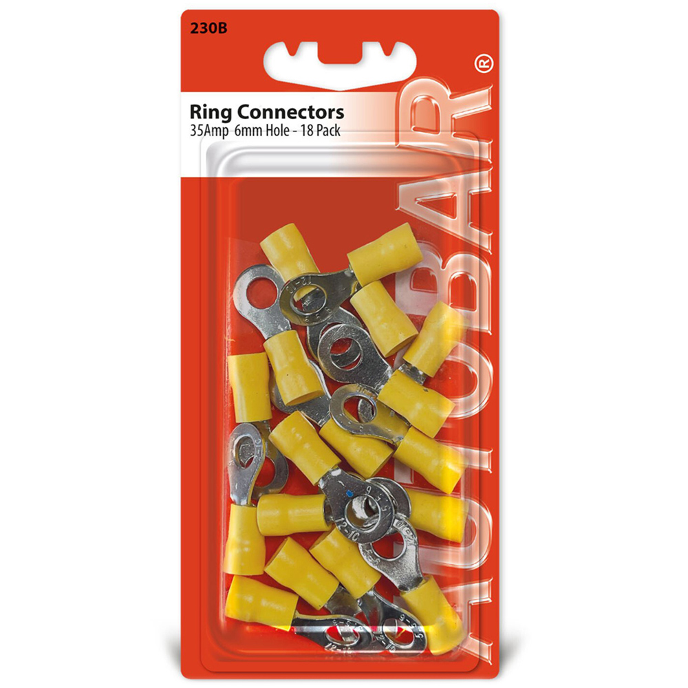 Securely fasten wires and cables to electrical studs and posts with this pack of eighteen yellow ring connectors. Each connector features a 6mm hole and durable yellow vinyl insulation, providing a reliable solution for diverse applications.