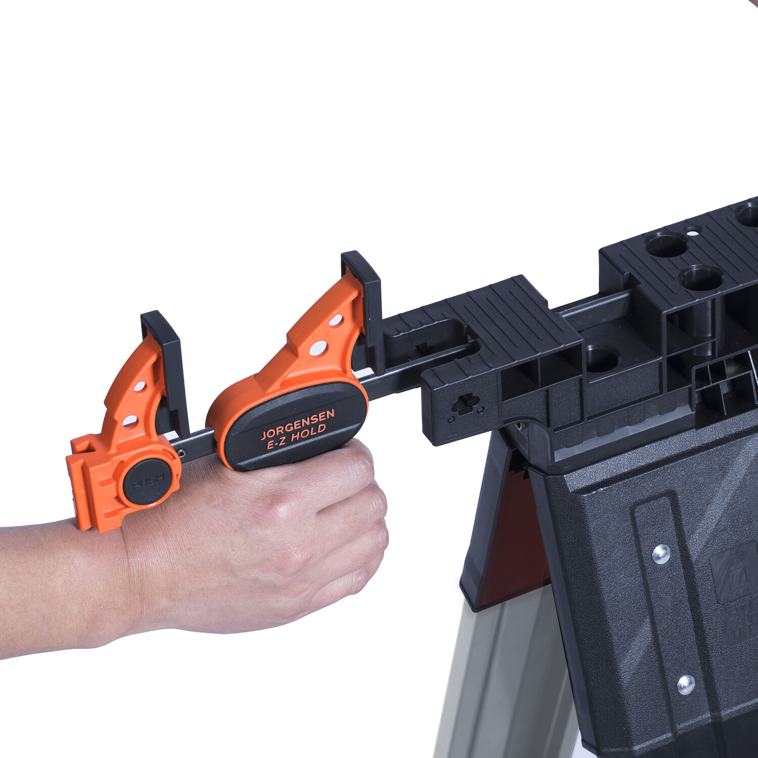 Boost your DIY or professional projects with this two-pack of versatile sawhorses. Each sawhorse offers a 600 lb weight capacity (1200 lbs combined). The integrated shelf keeps tools and materials readily accessible. Quick and easy setup and fold-down design allows for convenient storage and transport. Included bar clamps and angle adapter provide flexible horizontal and vertical clamping options directly on the sawhorse.