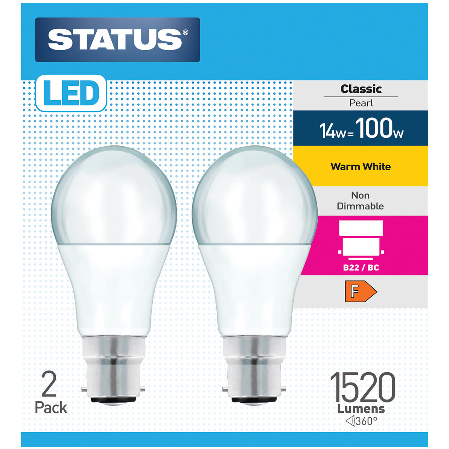 Pack of 2 Status LED 14W Non-Dimmable Classic Pearl Lightbulbs - Bayonet Cap / BC
