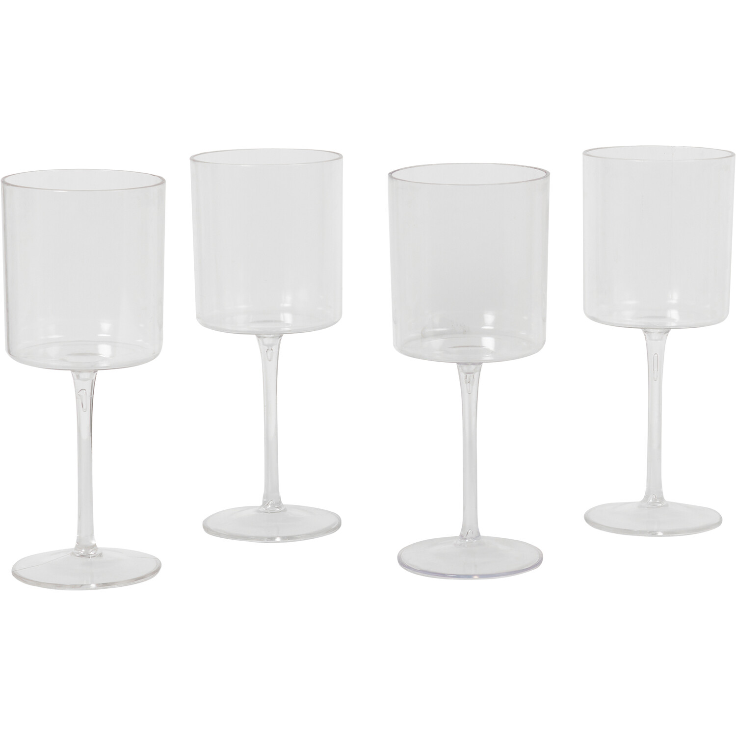 Four stylish, contemporary clear plastic wine glasses, perfect for picnics and garden parties. Easy to hold and clean, these reusable glasses are ideal for wine and other chilled beverages, adding a touch of modern practicality to your outdoor entertaining.