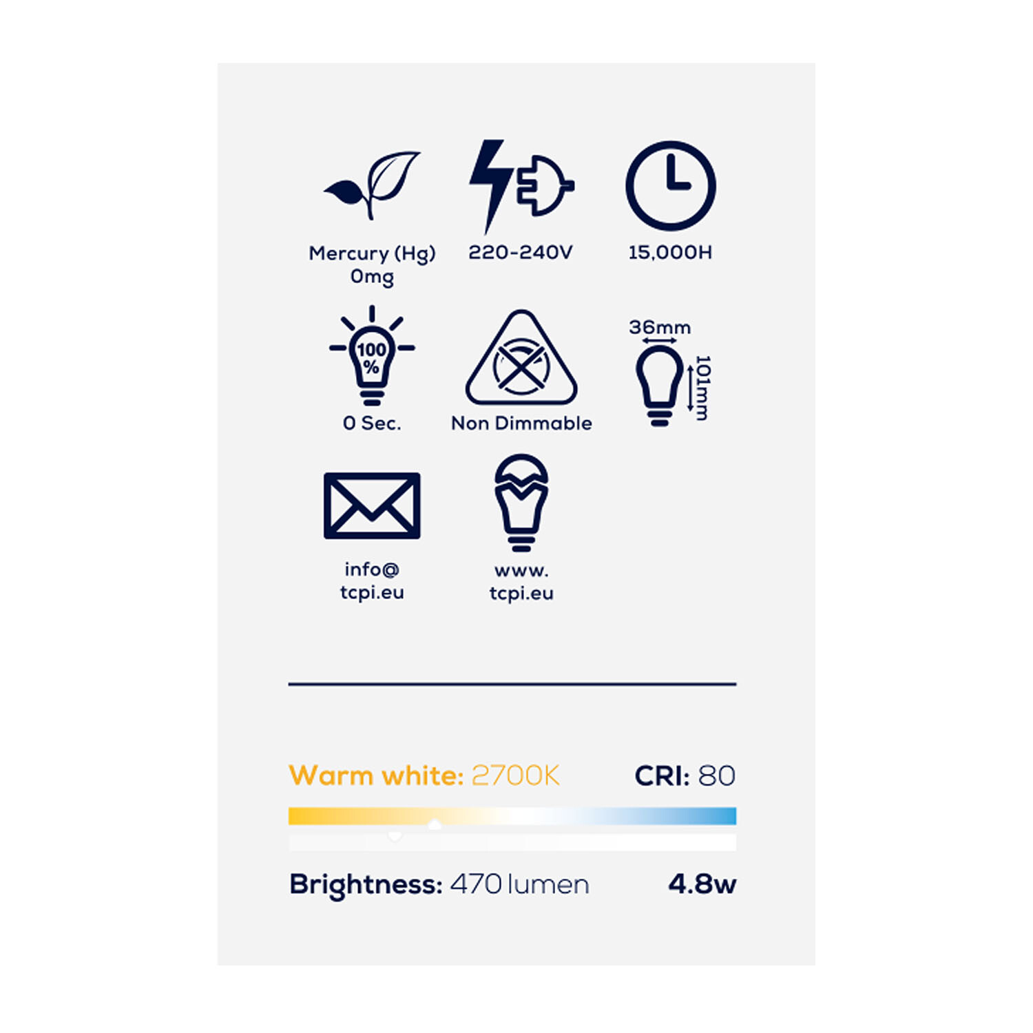 Create a warm and inviting atmosphere with this pack of five LED candle bulbs. Their beautiful candle shape and soft, warm white glow are perfect for living rooms, dining rooms, or any space needing decorative lighting. Each bulb offers 470 lumens and has an E14 fitting.