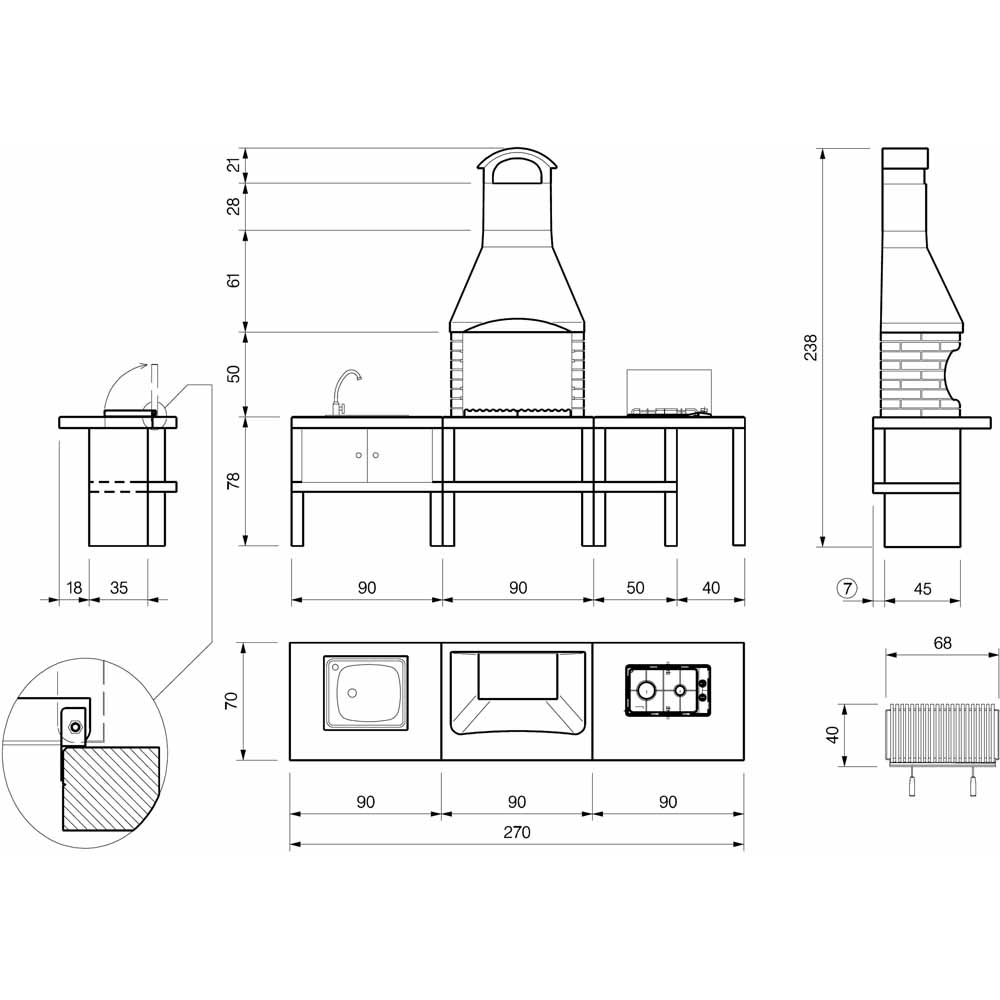 Elevate your outdoor culinary experience with this stunning Outdoor Kitchen, designed for both functionality and style. Constructed from high-quality refractory concrete, it features a sleek Marmotech work surface that is not only visually appealing but also built to last. This innovative material, a blend of refractory concrete and granulated marble, offers impressive heat resistance and requires no final painting, ensuring a polished look. At the core of this setup is a versatile barbecue that can be fuelled by either wood or charcoal. The choice of wood infuses your dishes with a distinctive aroma and flavour while generating higher temperatures. To withstand the intense heat produced by a log fire, the firebox and grill area are reinforced for durability. Experience precise cooking control with a height-adjustable stainless steel grill grate, measuring 68 x 43 cm, allowing you to easily manipulate the cooking temperature by adjusting the distance from the coals. On one side, a stainless steel sink with a convenient mixer tap enhances your cooking capabilities, while a twin stainless steel gas hob, complete with a lid and piezo ignition (68 x 40 cm), is situated on the opposite side for added versatility. Ample storage options are available, featuring double painted steel doors that conceal a centre shelf, ensuring your outdoor kitchen remains organised and clutter-free. This Outdoor Kitchen is supplied with two 310ml tubes of adhesive for assembly and a 10kg sealant paint for a flawless finish. With overall dimensions of W270 x D70 x H237 cm, it’s the perfect centrepiece for your outdoor space. Don’t forget to protect your investment with our premium range of BBQ covers.