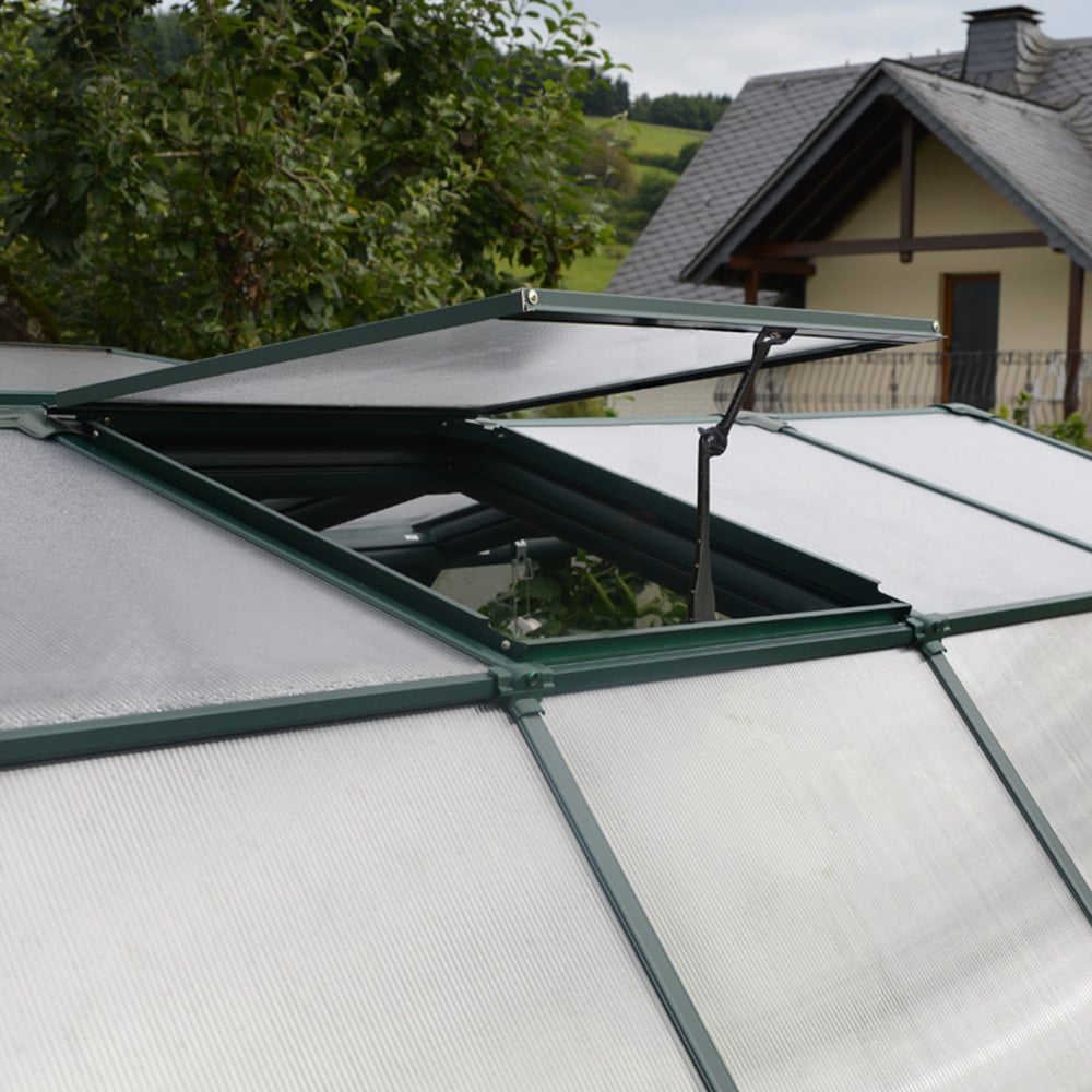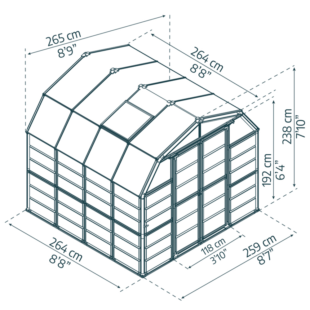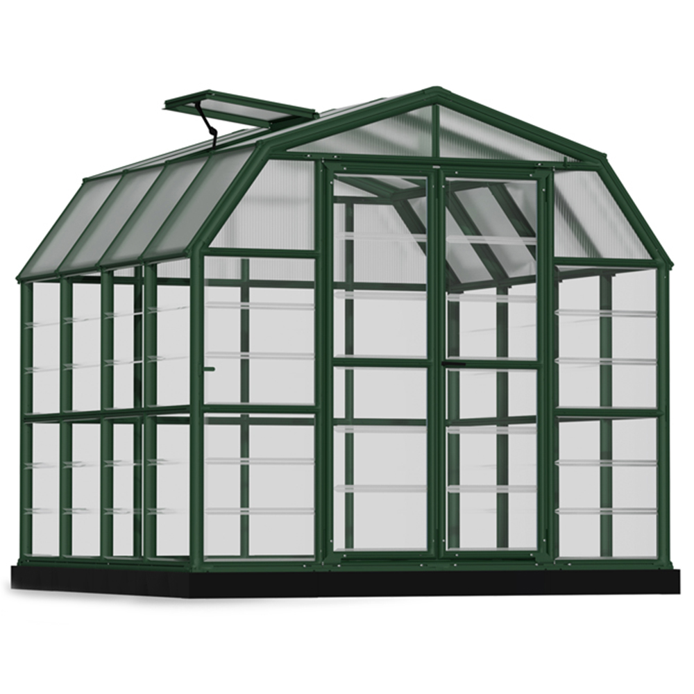 Step into a gardener's dream with the Palram Canopia Grand Gardener Greenhouse 8 x 8ft, designed to offer the ultimate growing environment. This greenhouse features two types of nearly unbreakable polycarbonate panels, crystal-clear side walls for unobstructed views and twin-wall roof panels that diffuse over 70% of sunlight, creating a soft, even light. The heavy-duty, UV-protected extruded resin frame, paired with aluminium roof profiles, enhances both insulation and durability. The spacious roof design provides ample headroom, allowing for more gardening space. Double doors ensure easy access and excellent ventilation, while the included roof vent offers a heat escape even when the doors are closed. The simplified pin and lock assembly make it ideal for growing enthusiasts. With twin-wall polycarbonate panels protecting from strong sunlight, a double door with a handle and holder for easy access, and rubber sealing strips on the frame to improve insulation, it is the perfect blend of style and functionality for all your gardening needs.