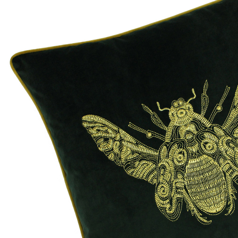 Elevate your home's style with the Paoletti Cerana Cushion. Drape this luxurious emerald velvet cushion across your sofa or bed for an instant touch of elegance. The reversible design features a beautifully embroidered bee on one side, complemented by piped edges for a classy look. Hard-wearing and stain-resistant, this charming cushion will remain a cherished addition to your décor for years to come.