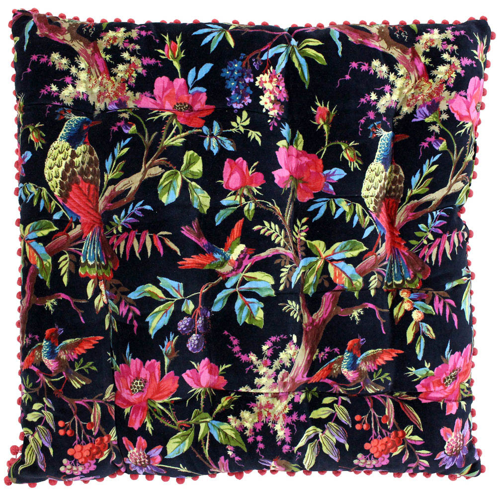 Add a touch of exotic elegance to your home with the Paradise Black Floor Cushion. Its chinoiserie-inspired design, featuring an intricate nature print of birds and flowers, will instantly elevate any room. The luxurious velvet fabric adds a beautiful sheen, while the playful pom-pom edges and quilted design offer a delightful textural contrast. Perfect for meditation, reading, or simply relaxing, this supremely soft and cosy cushion is crafted from 100% cotton. Filled with 100% hollow fibre polyester for ultimate plushness, it's the ideal addition for those who appreciate bold patterns or prefer a more understated aesthetic. For best care, dry clean only. However, it's both tumble dryable and iron-safe.