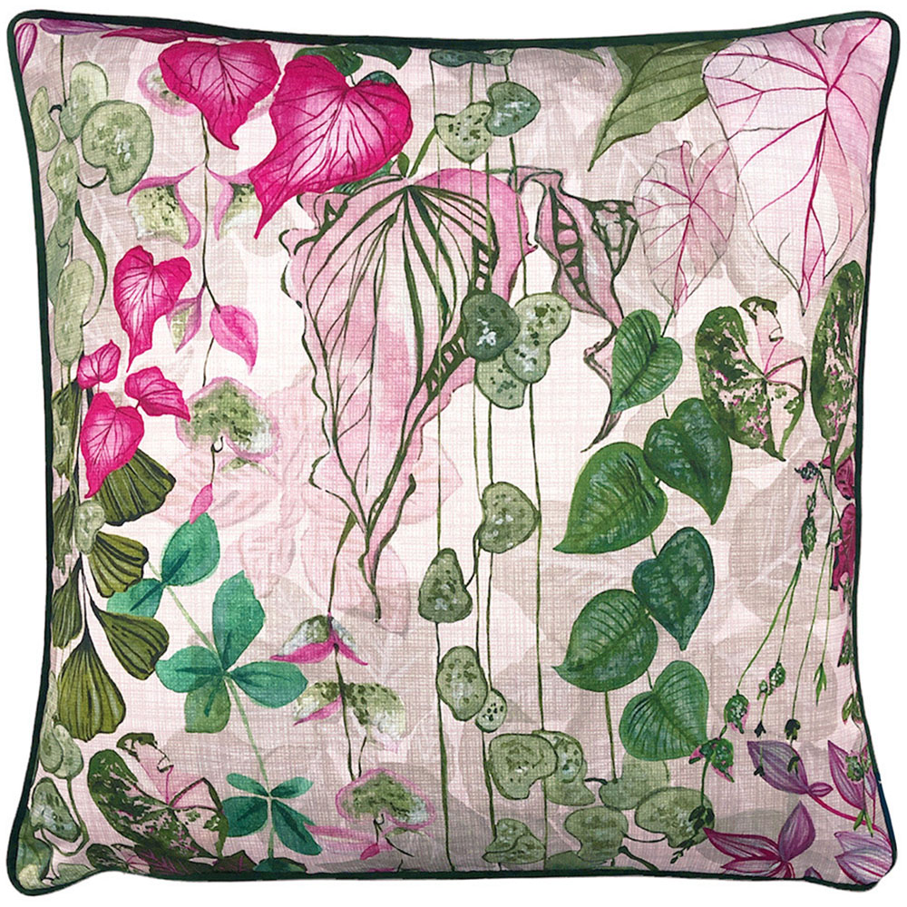 Elevate your home décor with the Paoletti Veadeiros Blush Large Botanical Cushion. Its intricate botanical design, showcasing lush, layered climbing plants, adds a touch of nature's elegance to any room. The soft-touch contrasting reverse offers a stylish contrast. Perfect for sofas, standalone chairs, and more, this cushion effortlessly enhances your living space.