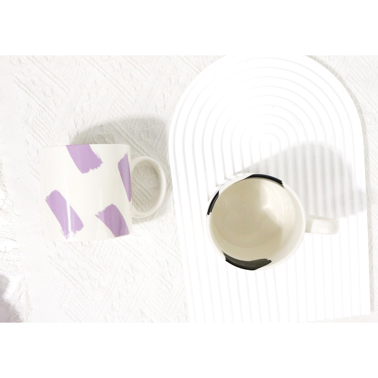A contemporary mug featuring a fun, abstract brushstroke design in black or purple. Its large handle with softly curved edges ensures comfortable handling. Perfect for hot drinks, this stylish mug will enhance any kitchen or dining space.