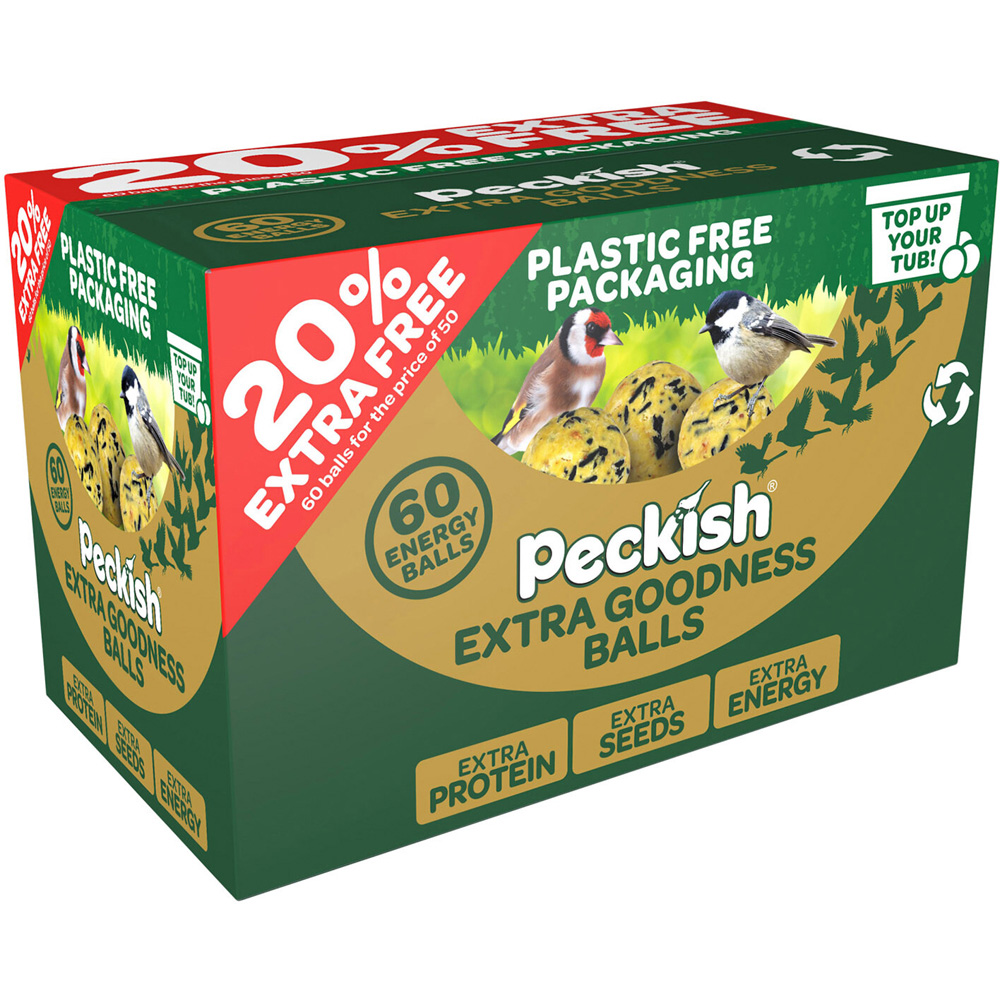 Fuel your garden birds with the Pack of 50 Extra Goodness Balls. Bursting with peanuts and sunflower seeds, these energy-rich treats contain no unnecessary fillers. Providing essential fuel for soaring birds, these balls boast 55% more protein and 68% more oils and fats than standard fat balls. What's more, this pack includes an extra 20%, giving you a total of 60 balls of pure goodness for your chirping garden visitors.