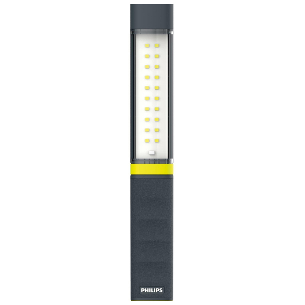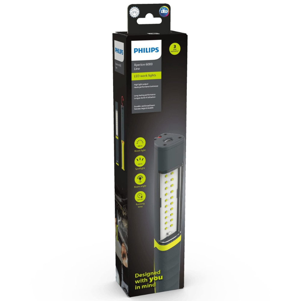 Power up your workspace with the Philips Xperion 6000 Line LED Work Light. This robust work light delivers natural, bright white light from its powerful LED, minimizing eye strain for fatigue-free performance. Choose between two brightness levels: 150 lumens in eco mode for extended battery life (up to eight hours), or 300 lumens in boost mode for maximum illumination (lasting 4.5 hours). Need even longer runtime? The integrated torch beam provides nine hours of continuous light on a single charge. A powerful Li-ion battery keeps you going, and USB-C charging provides a full recharge in just 3.5 hours. The 110° beam angle ensures wide area coverage, while the ergonomically designed, anti-slip handle provides a secure grip. Hands-free operation is a breeze thanks to the 360° rotatable, retractable hook and strong magnet. Get the job done, efficiently and comfortably.