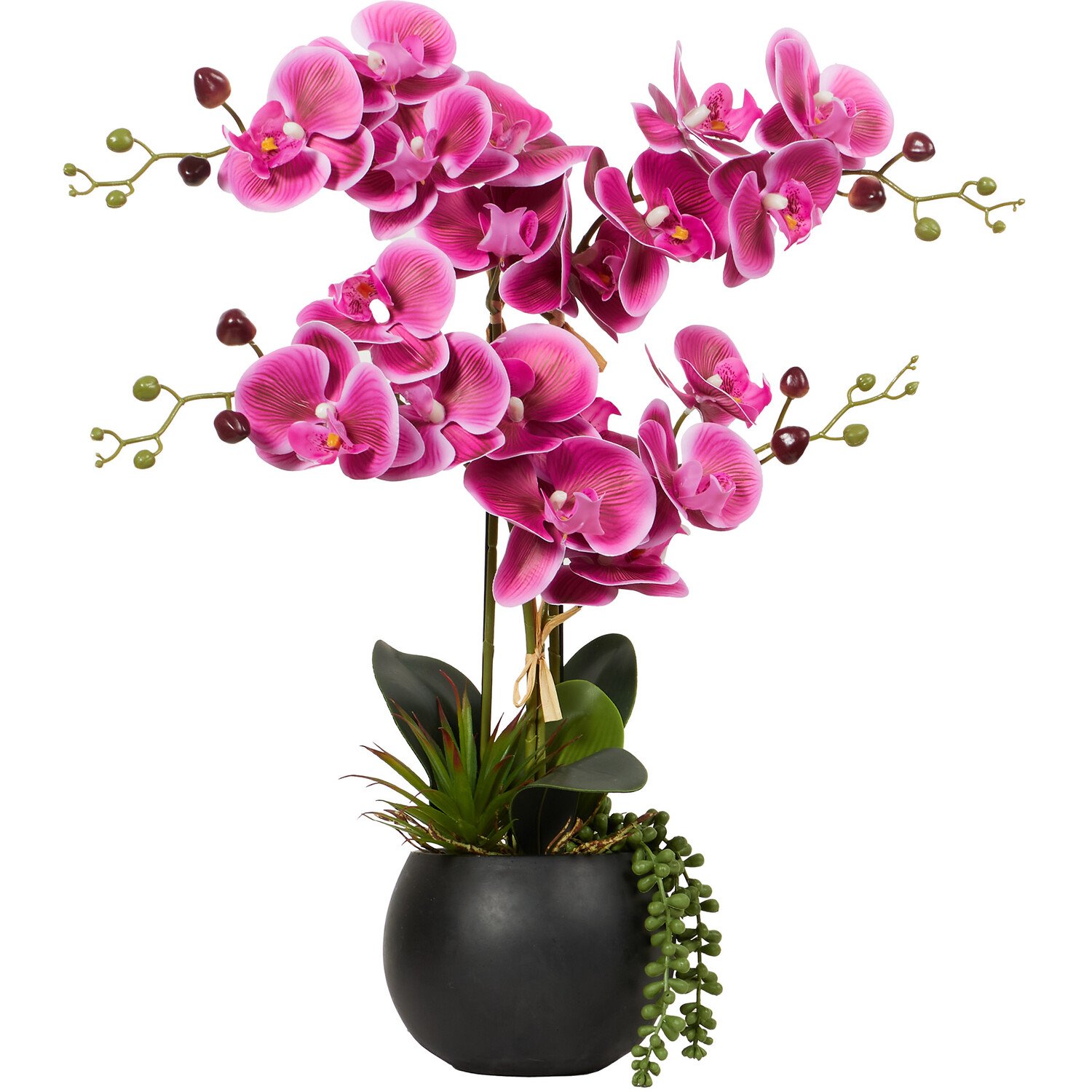 Enhance your home or office decor with this Pink Orchid in Black Pot with Succulent. This arrangement features a lifelike pink orchid beautifully paired with a succulent, all set in a sleek, black-coloured ceramic pot. This artificial flowerpot is ideal for adding nature's touch to your indoors without worrying about everyday maintenance.