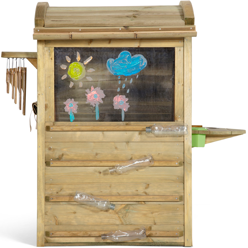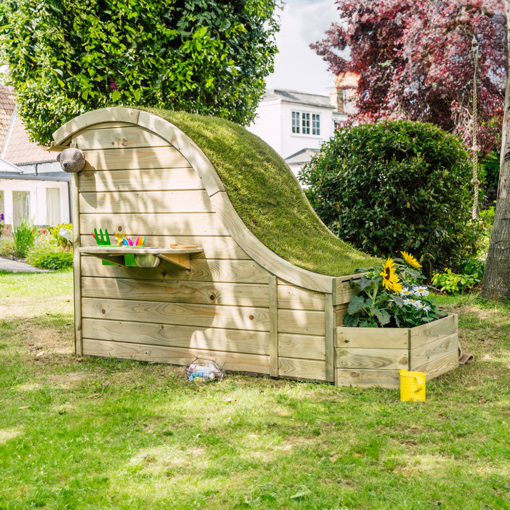 Unleash your child's imagination with the Discovery Nature Play Hideaway! This enchanting outdoor haven, crafted from sustainably sourced FSC-certified timber, offers 360° of play possibilities. Let nature inspire their creativity. The turf-ready roof blends seamlessly with any garden, creating a magical retreat, whether in a city garden or countryside setting. Little chefs will love the mud kitchen, complete with sink, pots, hob, and accessories for collecting and creating delightful mud pies. The easy-clean painting screen and paintbrush pens encourage artistic expression—simply wash off and create again! Storage pots keep garden treasures organized, while bamboo wind chimes add a delightful sensory element. A swinging mini letterbox adds to the fun, and a built-in planter lets budding gardeners nurture their own mini eco-centre. Ingeniously designed to recycle water from the roof to the planter, or collected via a bamboo gutter, this hideaway promotes sustainable play.