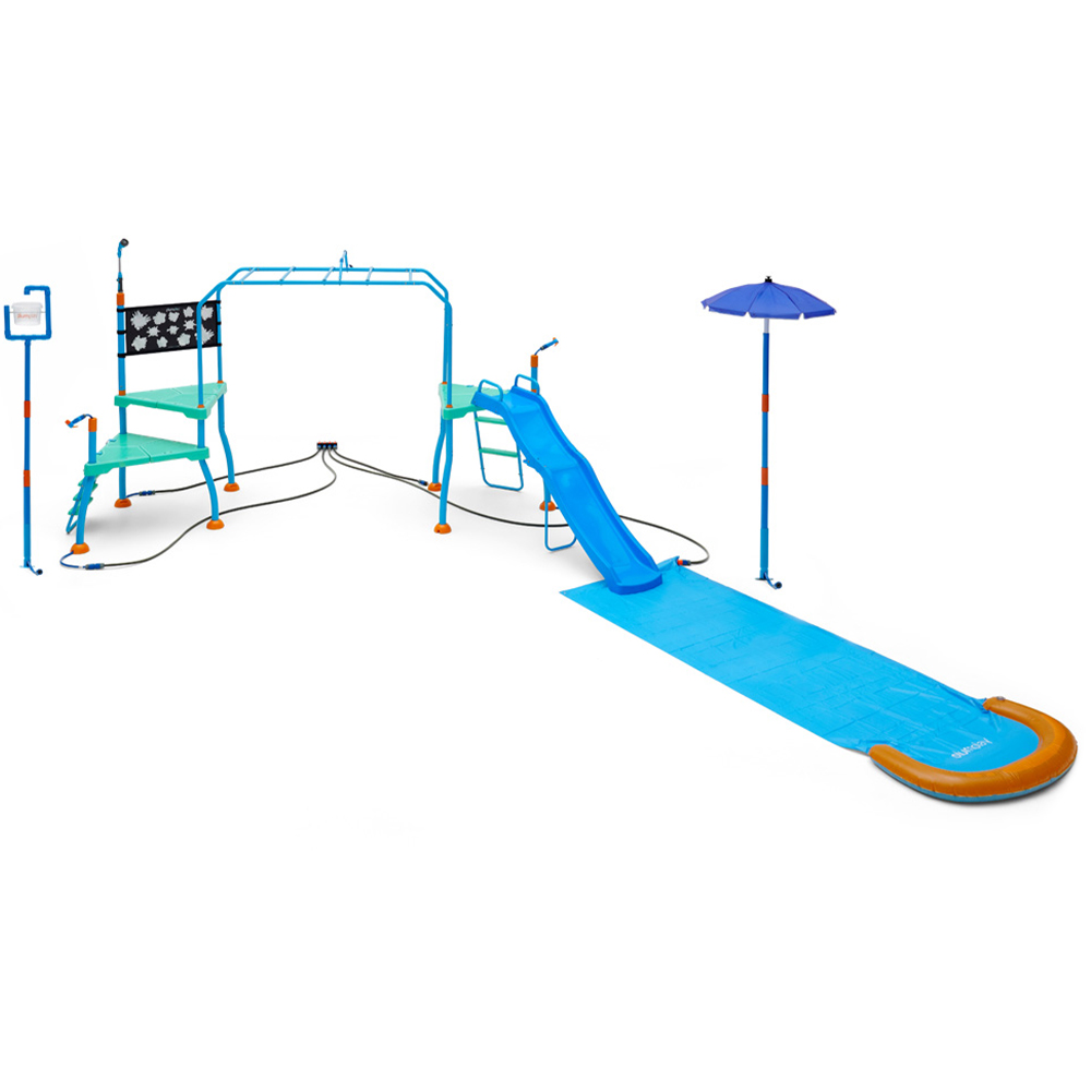 Enjoy your very own home water park! The Plum Play Water Park Blaster Course brings all the thrills of a water park to your garden. Simply connect a hose, and let the fun begin! This water play centre features three built-in water accessories and two freestanding water toys, designed to encourage active play and develop children',s coordination and motor skills. Two water blasters are perfect for friendly water fights or target practise, while the eight-pattern sprinkler provides refreshing cool-down on sunny days. For the ultimate water park experience, two height-adjustable water toys are included: a Tidal Tipper bucket for big splashes, and an Umbrella Fountain for a cascading rain shower – embrace the downpour or seek shelter! The fun continues with a water-reveal colouring wall, where kids can uncover hidden sea creatures by aiming the water blasters, combining learning with playtime. The course also boasts monkey bars with a rainfall wall, leading to a thrilling six-foot water slide and three-metre water chute, complete with sprinklers for an epic splash landing. Perfect for wet and dry play, this centre offers year-round entertainment. It includes a four-way hose connector, slip-resistant platforms and steps, and a powder-coated, galvanised steel frame for lasting protection against rust.