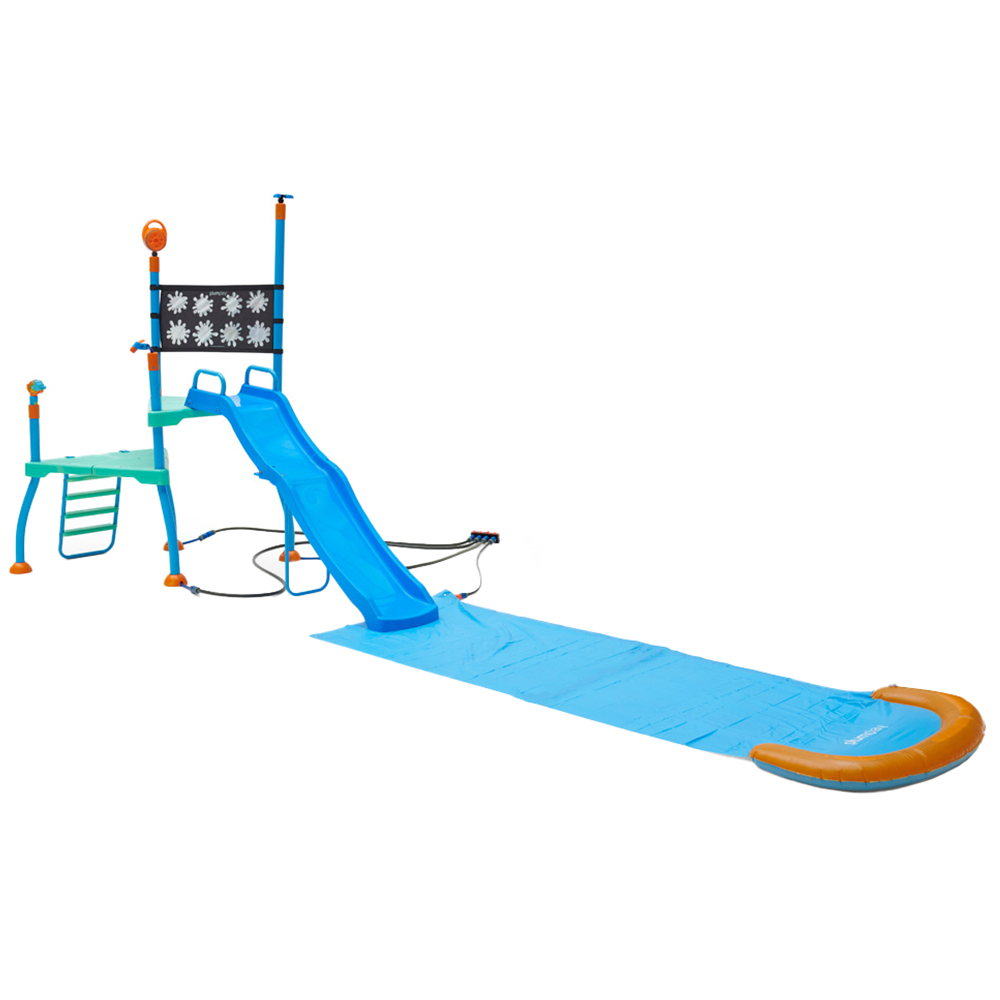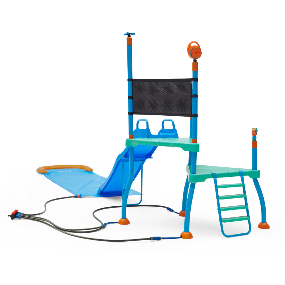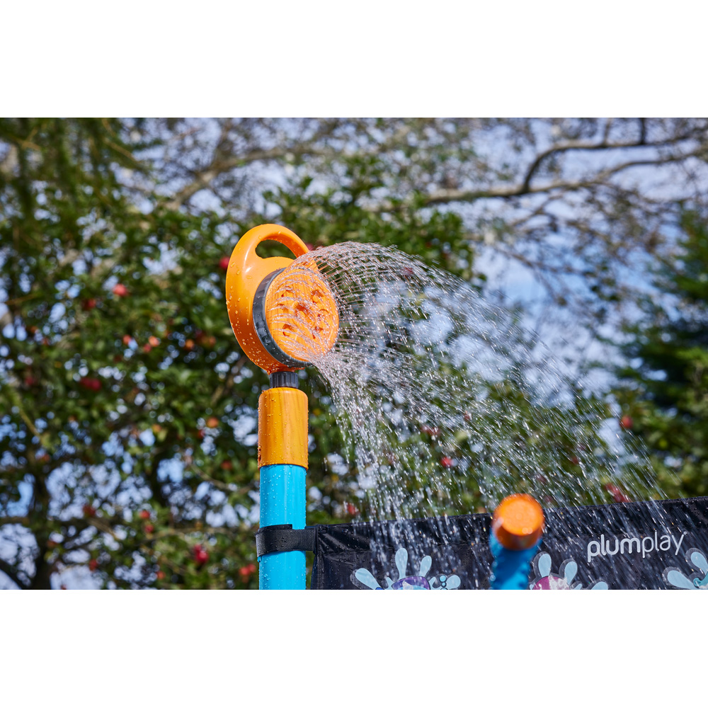 Bring the water park home! The Plum Play Water Park Shower Tower transforms your garden into a splashing adventure zone. Kids can climb, slide, and soak up the fun with four fantastic water features designed to boost active play and develop coordination. Engage in epic water battles with the water blaster, perfect for honing aim or friendly competition. Stay cool on sunny days with the eight-pattern, three-arm sprinkler, while the bubble blower adds a delightful sensory dimension. Unleash even more fun with the water-reveal colouring wall – little ones can discover hidden sea creatures by aiming the water blaster to reveal the underwater world, blending learning with playtime. This wall also doubles as a creative canvas when used with a paintbrush and water pot. The excitement culminates with a thrilling six-foot slide down a three-metre water chute, complete with built-in sprinklers for a totally soaking experience. Pool sprinklers add extra splash-tastic fun. This centre is perfect for wet and dry play, promising endless year-round entertainment. It includes a four-way hose connector, slip-resistant platforms and steps for safety, and a powder-coated, galvanised steel frame for lasting rust protection.